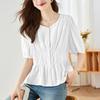 Asymmetric Pleated White Shirt for Women's Middle Sleeve Summer Round Neck Waist Doll Shirt Top Chic Style Shirt