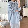 VONDA Womens Casual Stand Neck Ruffled Hem Striped Print Loose Long Sleeve Blouse