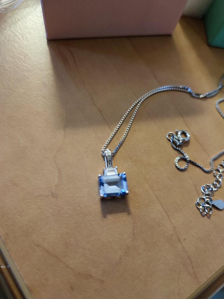 UMCHO NECKLACE A necklace with an elegant and refined style. I am always satisfied with the articles of this brand. Stylish models, low prices and attention to detail. 😍 The necklace comes with the gift box. Perfect for a gift, you will make a great impression. In the package the seller also put a gift: a small cloth to clean the silver. Necklace material: 925 silver. The brand is imprinted. On the pendant there is a light blue zircon with a rectangular cut measuring 7 x 9 mm and small white zircons. The chain is approximately 20.2 cm long and can be extended by another 5 cm. Fully functional snap hook closure. The crystals are extremely bright and carefully set. No defects, no glue stains. Recommended purchase 👌