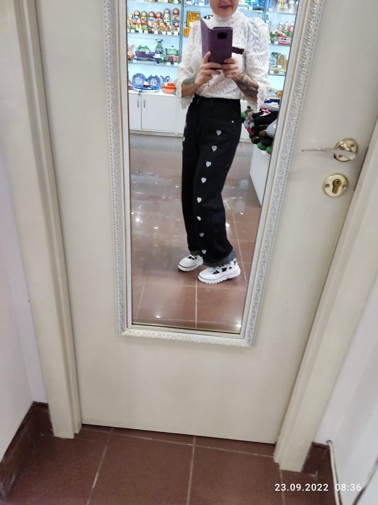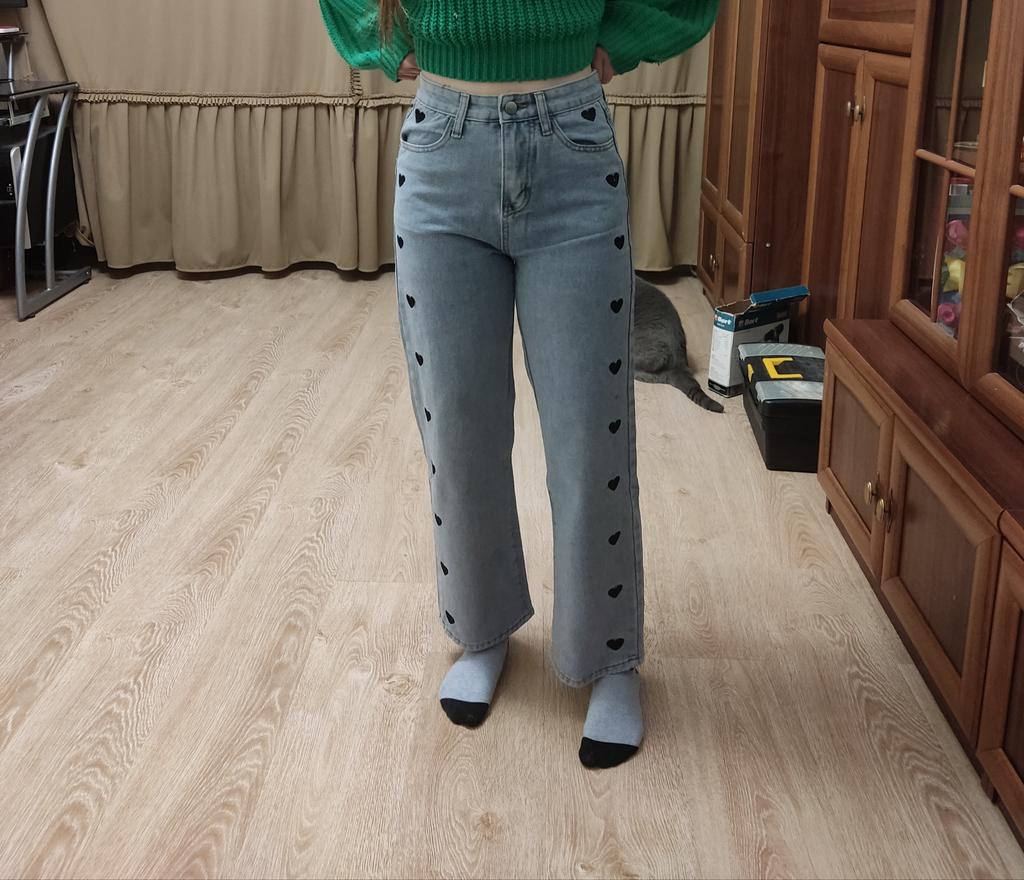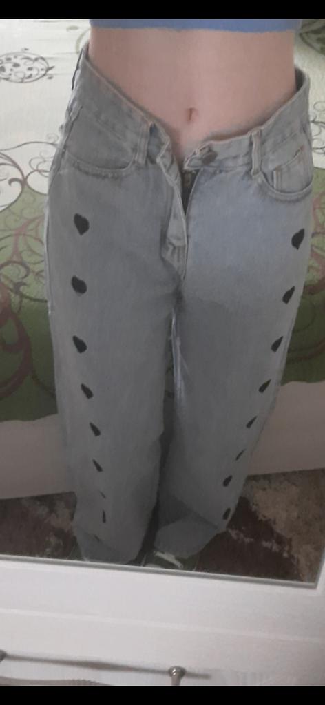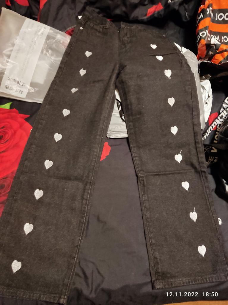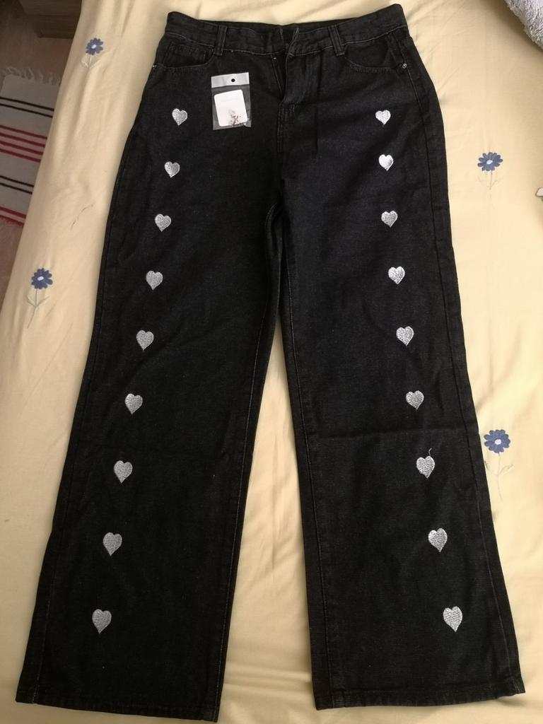 DARK GREY HEART WIDE LEG JEANS This is a pair of wide or pipe leg jeans with embroidered hearts down the legs, reminiscent of the jeans we wore back in the 90s. ππ It's funny how all the styles of the past get recycled and I remember parents rolling their eyes at these. π The fabric is not 100% cotton as claimed, but 78.1% cotton with 3 other synthetics. π Regardless, they feel like cotton though they are thin compared to most jeans and not appropriate for winter weather. I'll put them aside til the weather gets nicer. π Seller's dimensions for XL Waist: 76 cm Hips: 105 cm Length: 99 cm My pair Waist: 72 cm Hips: 102 cm Length: 101 cm I'm so glad these were slightly smaller than advertised as they are quite big. The button hole was sewn up and needs to be cut open. π¬ Shipping was about a month from China to western Europe. These came in a plastic bag. I recommend these jeans and kindly ask the seller to update the fabric type to represent reality. Thanks!π