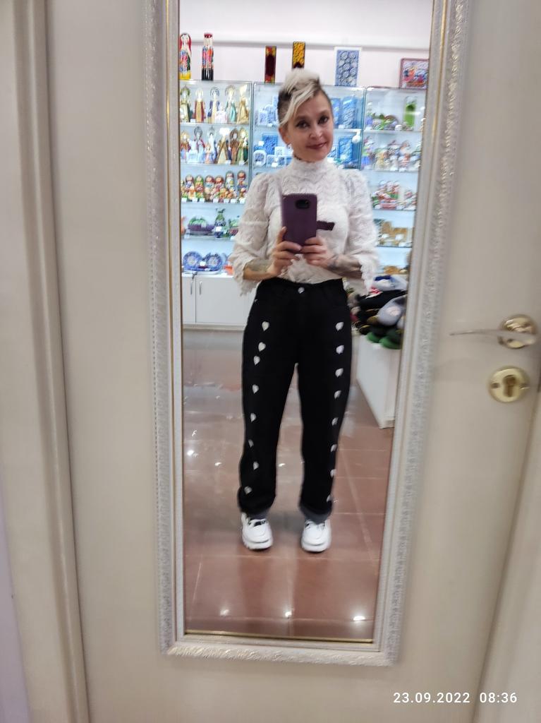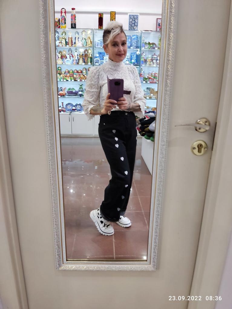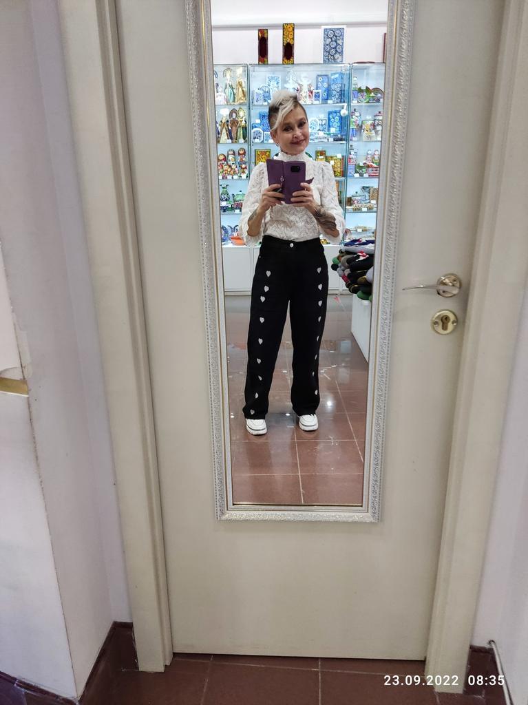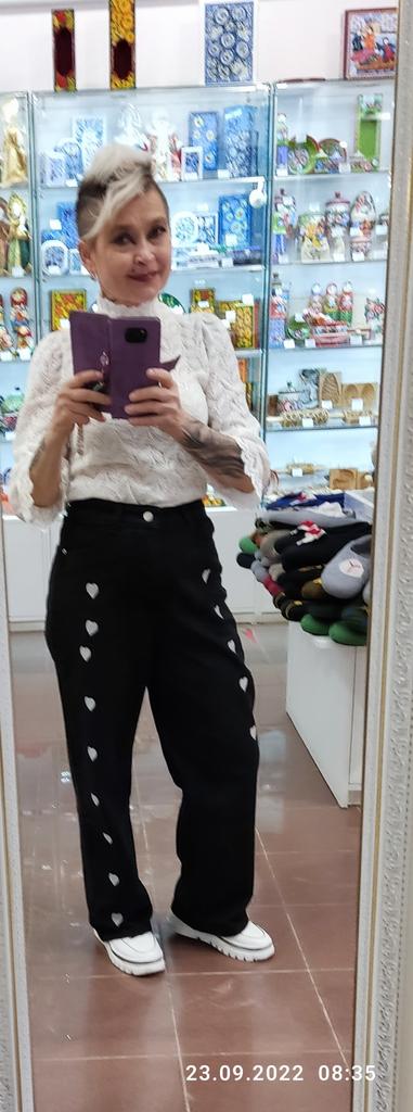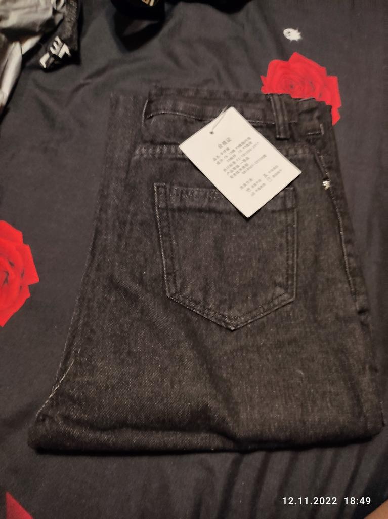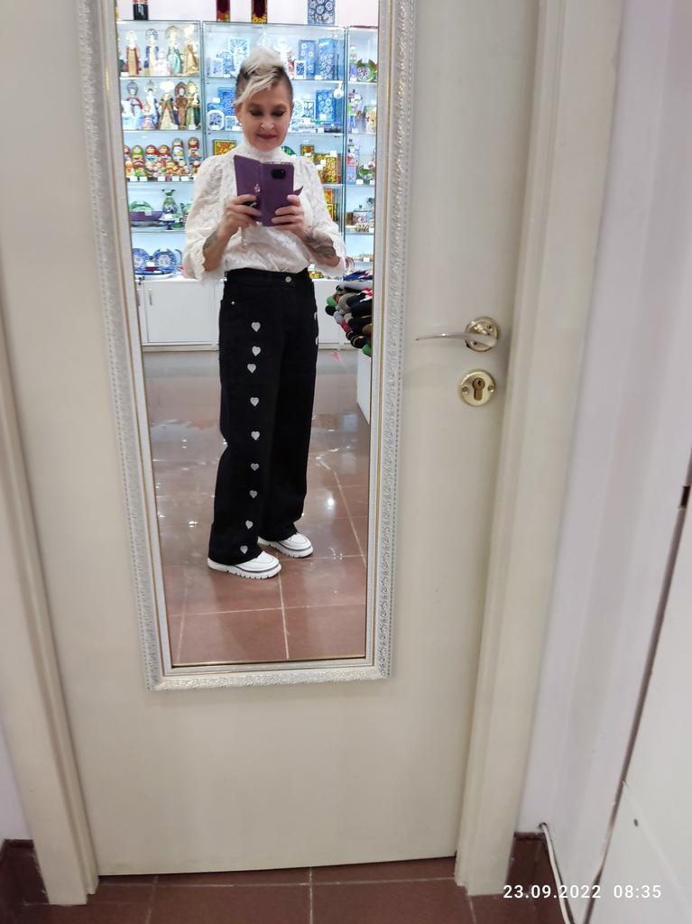DARK GREY HEART WIDE LEG JEANS This is a pair of wide or pipe leg jeans with embroidered hearts down the legs, reminiscent of the jeans we wore back in the 90s. ππ It's funny how all the styles of the past get recycled and I remember parents rolling their eyes at these. π The fabric is not 100% cotton as claimed, but 78.1% cotton with 3 other synthetics. π Regardless, they feel like cotton though they are thin compared to most jeans and not appropriate for winter weather. I'll put them aside til the weather gets nicer. π Seller's dimensions for XL Waist: 76 cm Hips: 105 cm Length: 99 cm My pair Waist: 72 cm Hips: 102 cm Length: 101 cm I'm so glad these were slightly smaller than advertised as they are quite big. The button hole was sewn up and needs to be cut open. π¬ Shipping was about a month from China to western Europe. These came in a plastic bag. I recommend these jeans and kindly ask the seller to update the fabric type to represent reality. Thanks!π