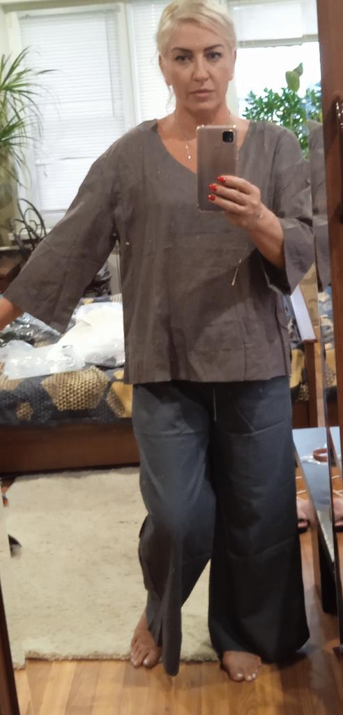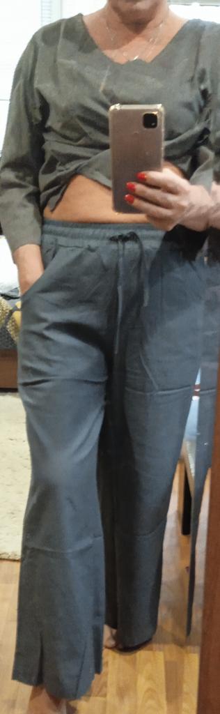 I ordered pants for the second time. The quality was completely different, the first ones were more like linen. The color is not as green as the first.