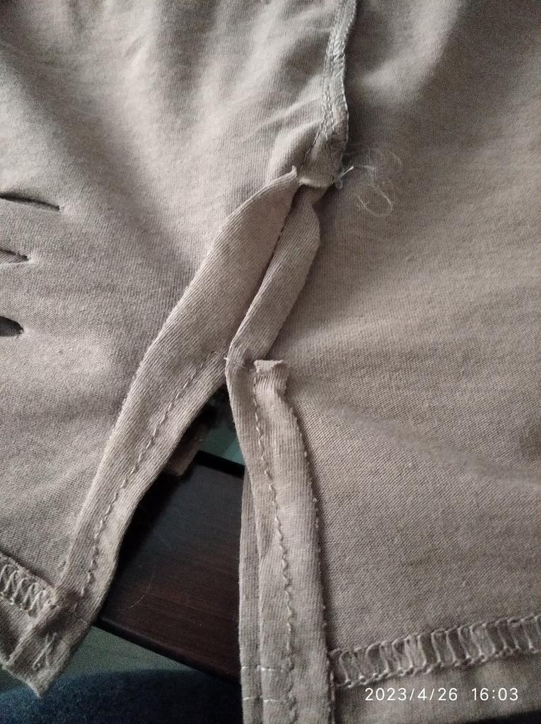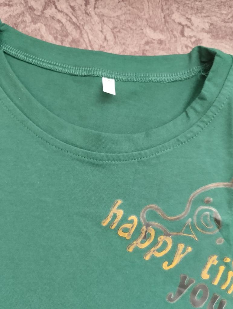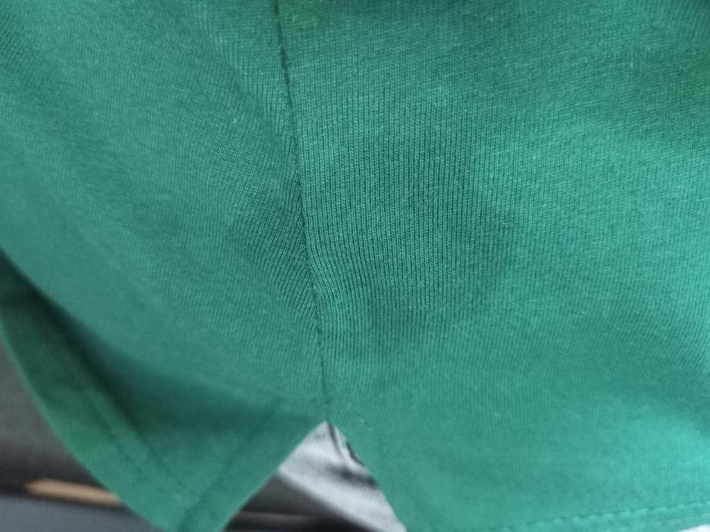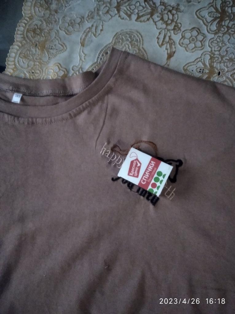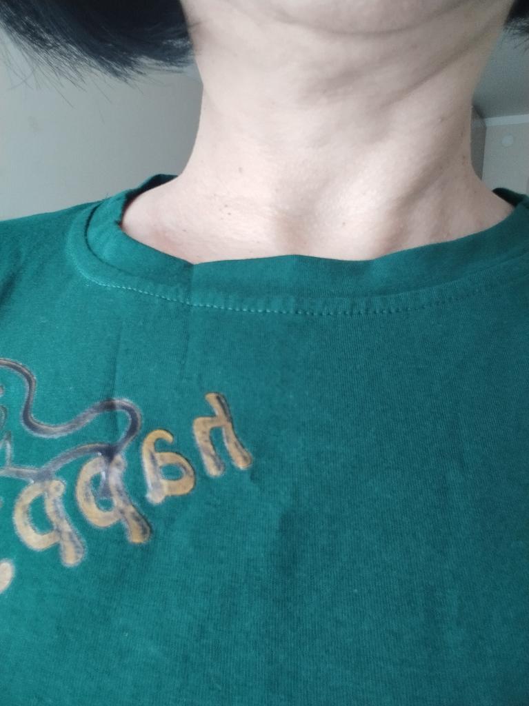 On the sleeves on the side there is no drawing but three ordinary cuts made with scissors. The drawing is almost not visible - on the dark green background of the T-shirt there is a black and yellow sticker-inscription. The only plus is that the cotton is good