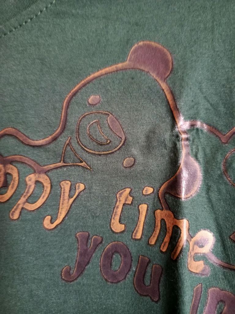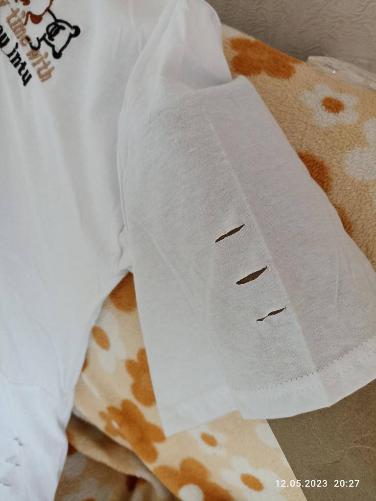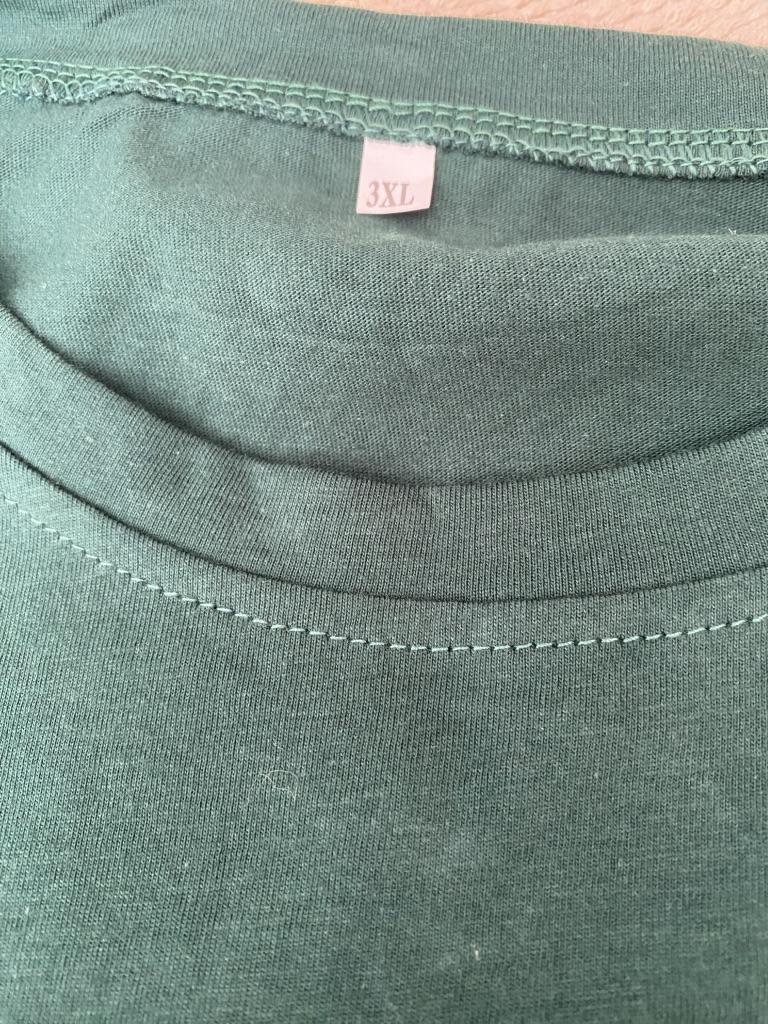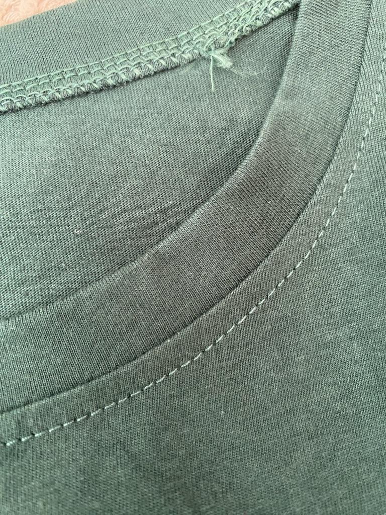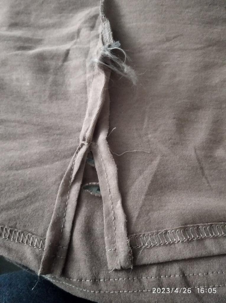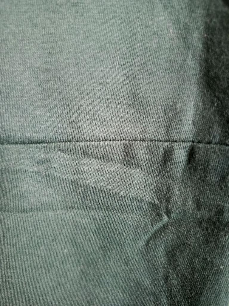 On the sleeves on the side there is no drawing but three ordinary cuts made with scissors. The drawing is almost not visible - on the dark green background of the T-shirt there is a black and yellow sticker-inscription. The only plus is that the cotton is good