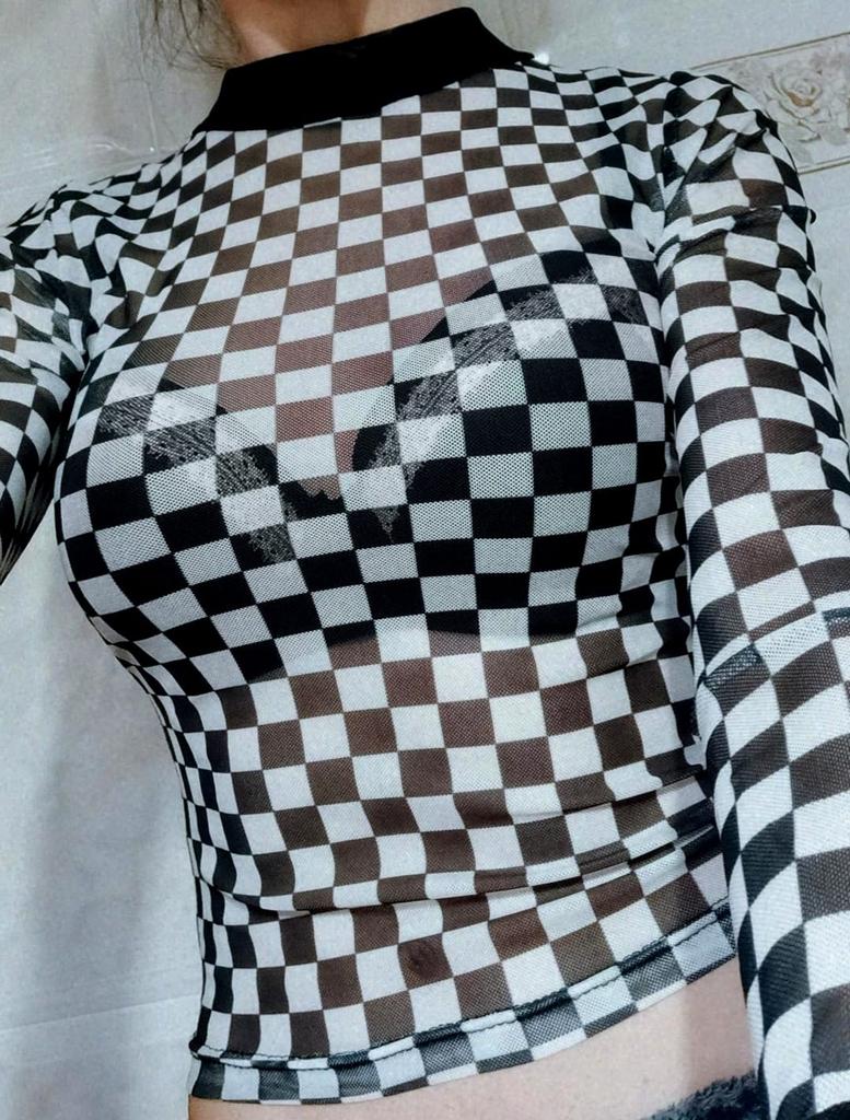 Sexy Black White Plaid Checkerboard T-shirts for Women Hollow Out Slim Top Female T-shirt Long Sleeve Tee Shirts