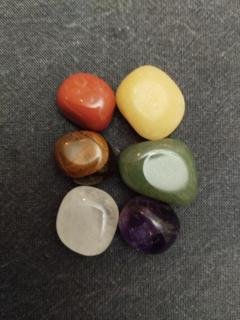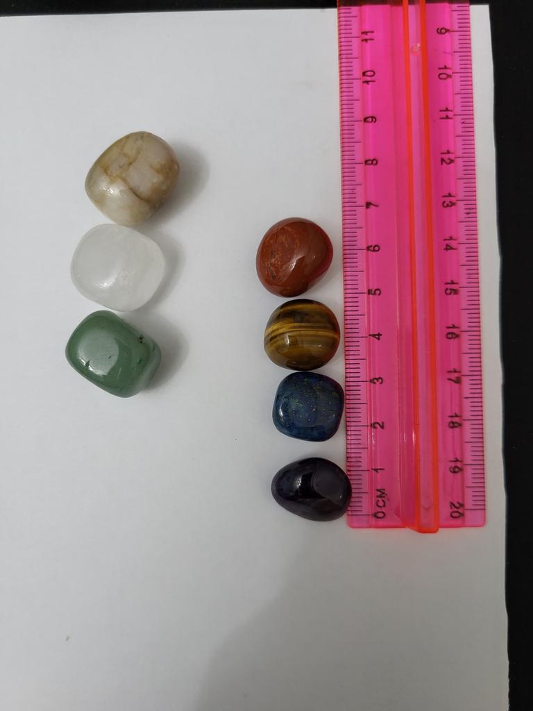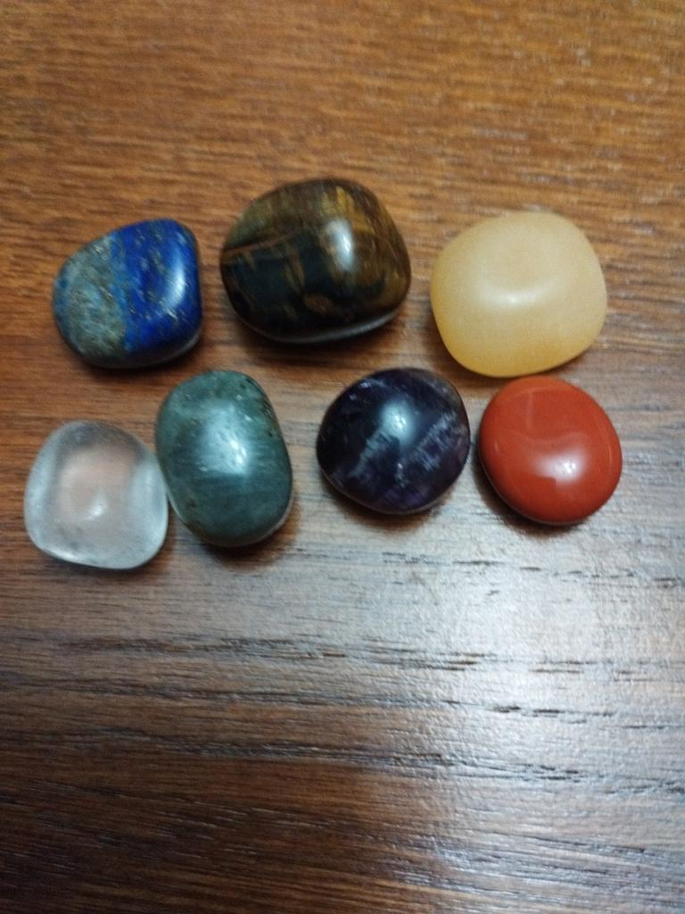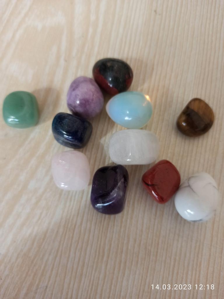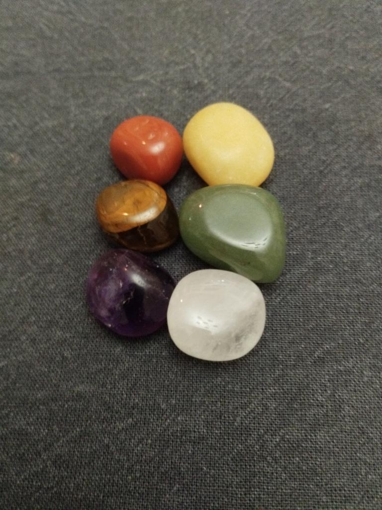 The stones according to the color of the chakras, each with its own unique shape and size, are perfectly polished. In a velvet bag.