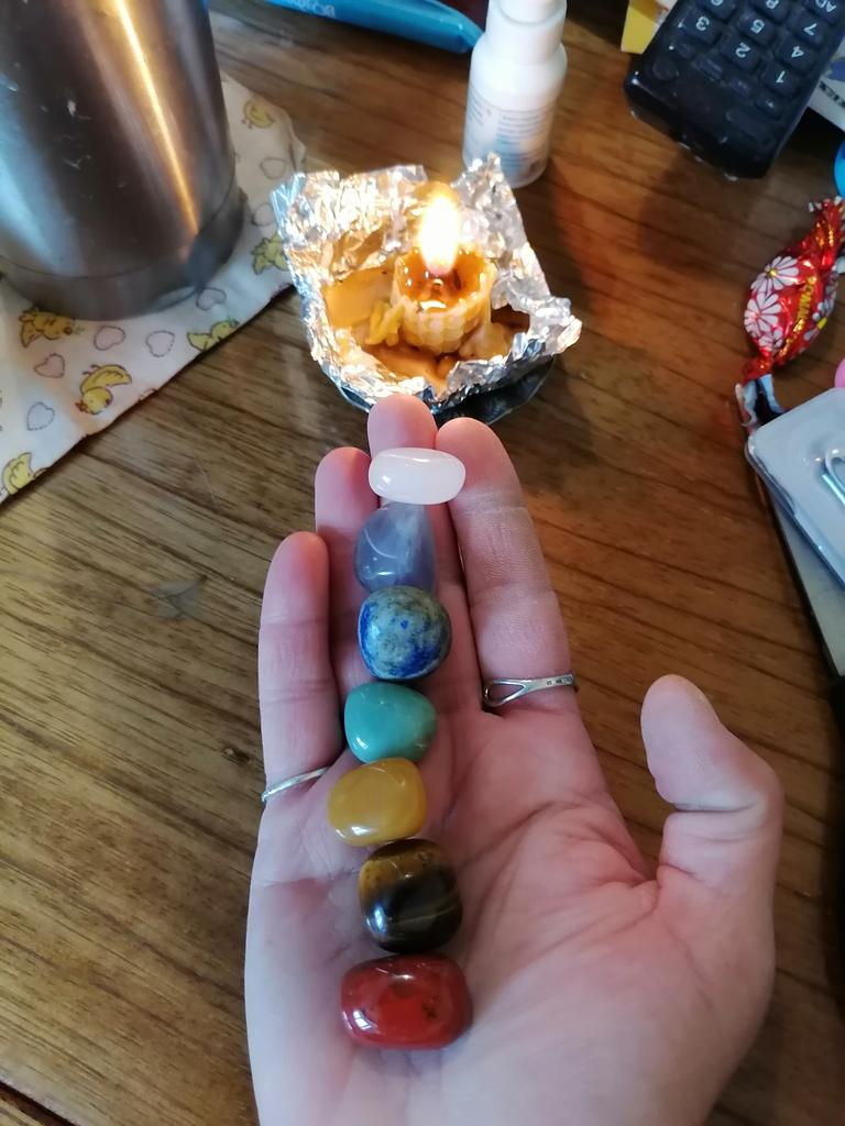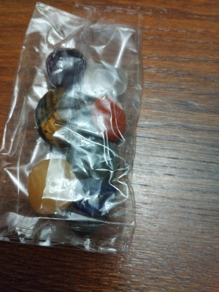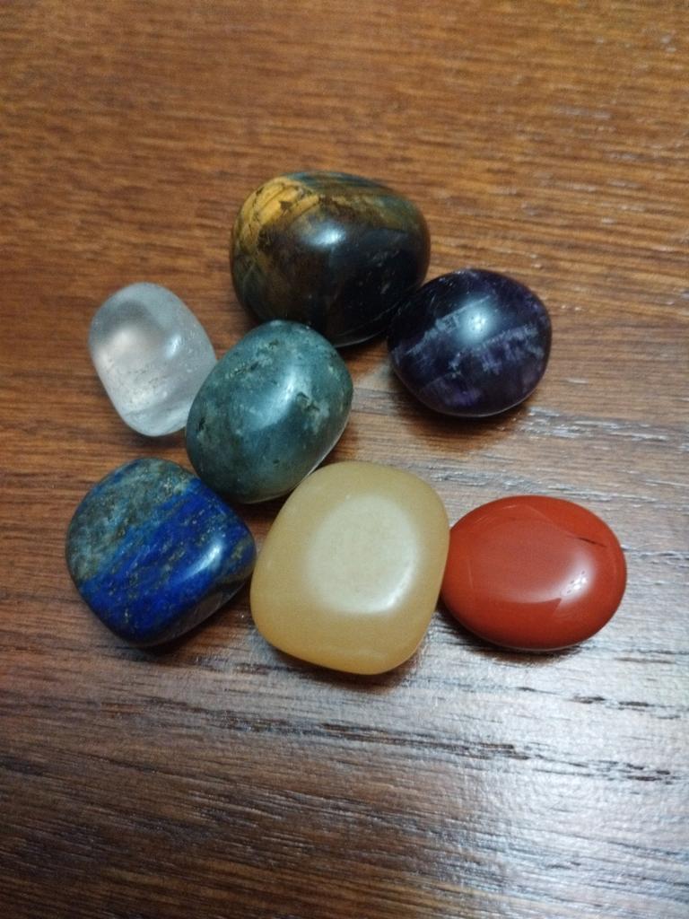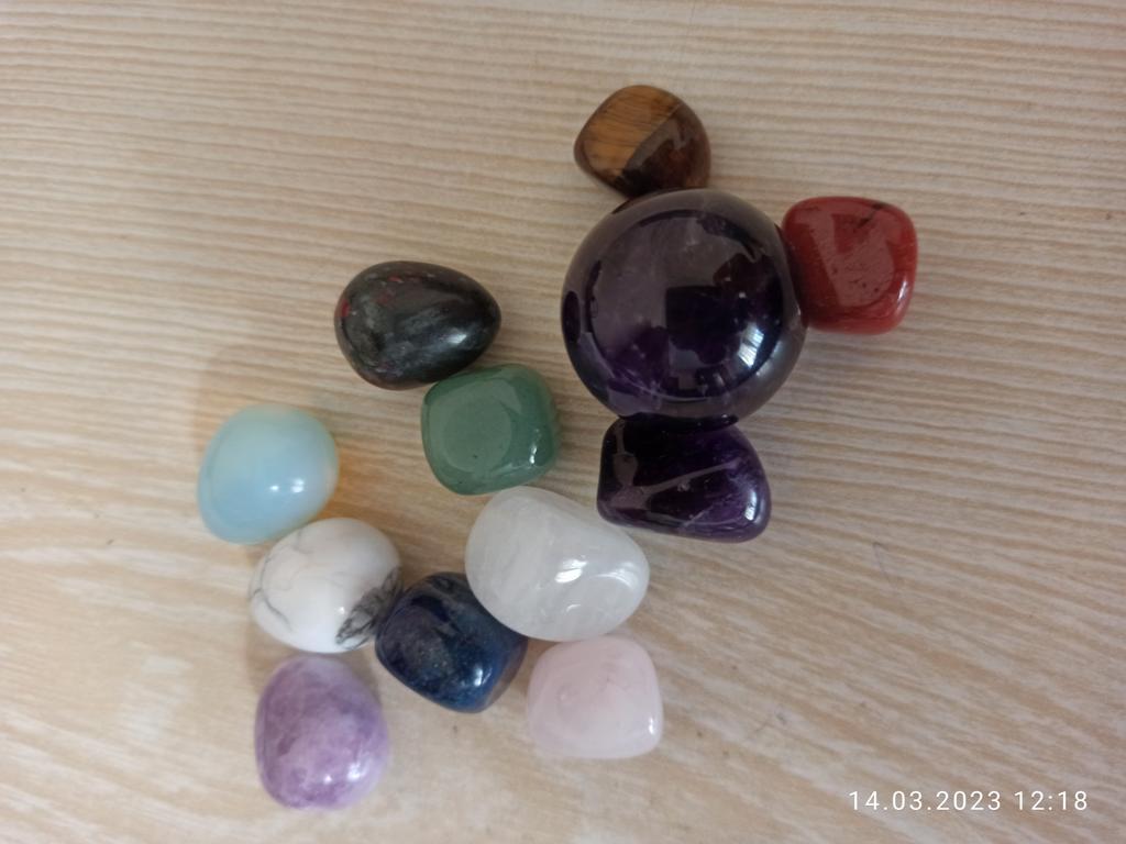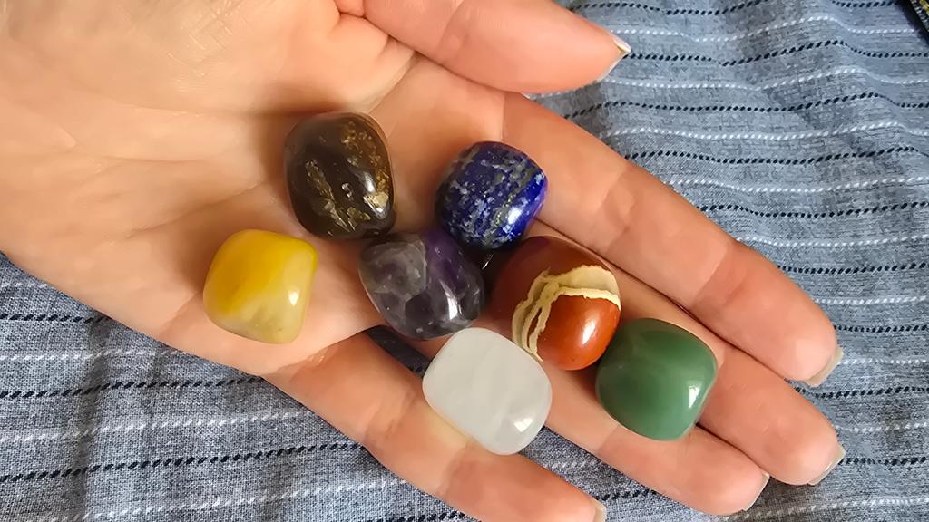 The stones according to the color of the chakras, each with its own unique shape and size, are perfectly polished. In a velvet bag.