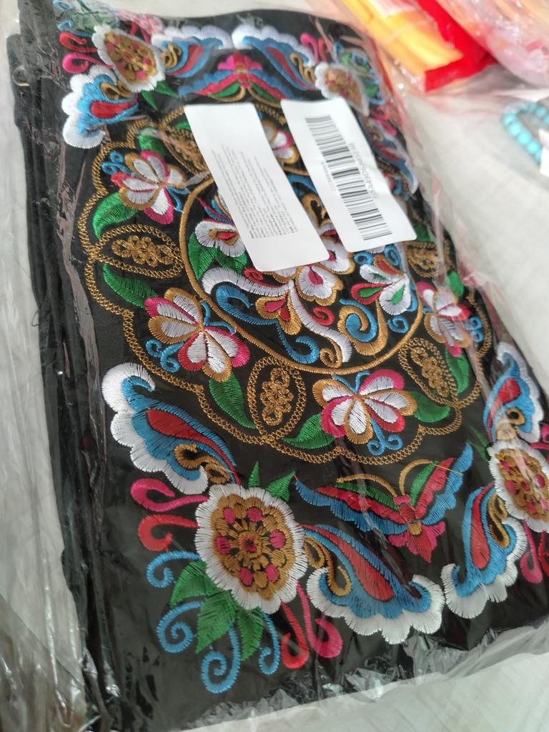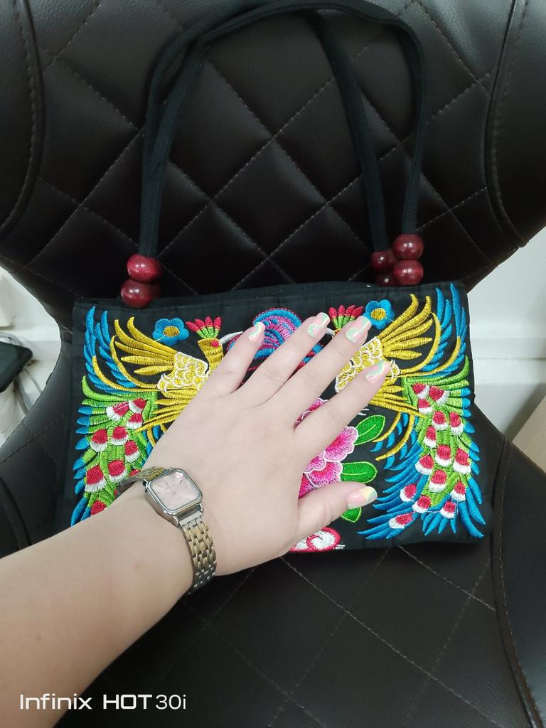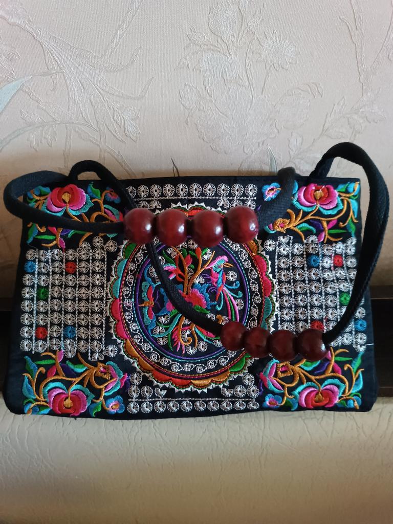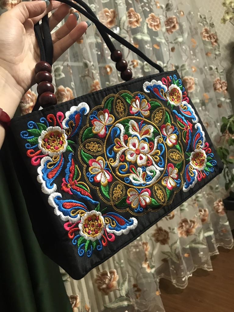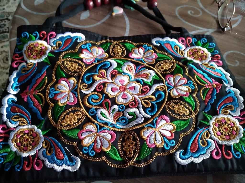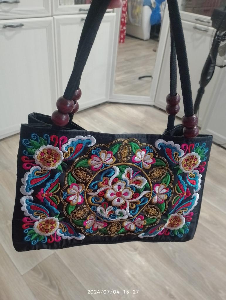 Very beautiful, bright, festive, and neatly made pattern. Exactly like in the photo! The handbag is small, so it doesn't look like a practical everyday bag)). Satisfied, thank you!