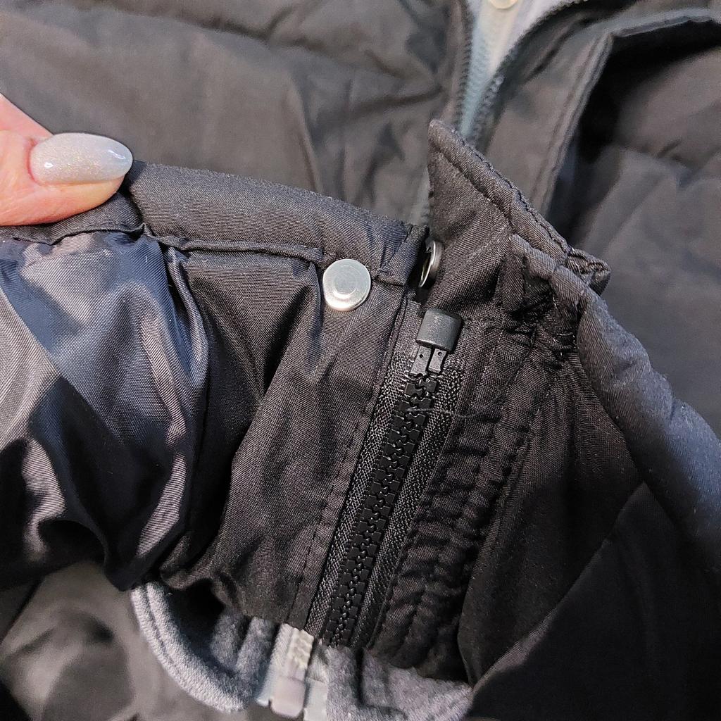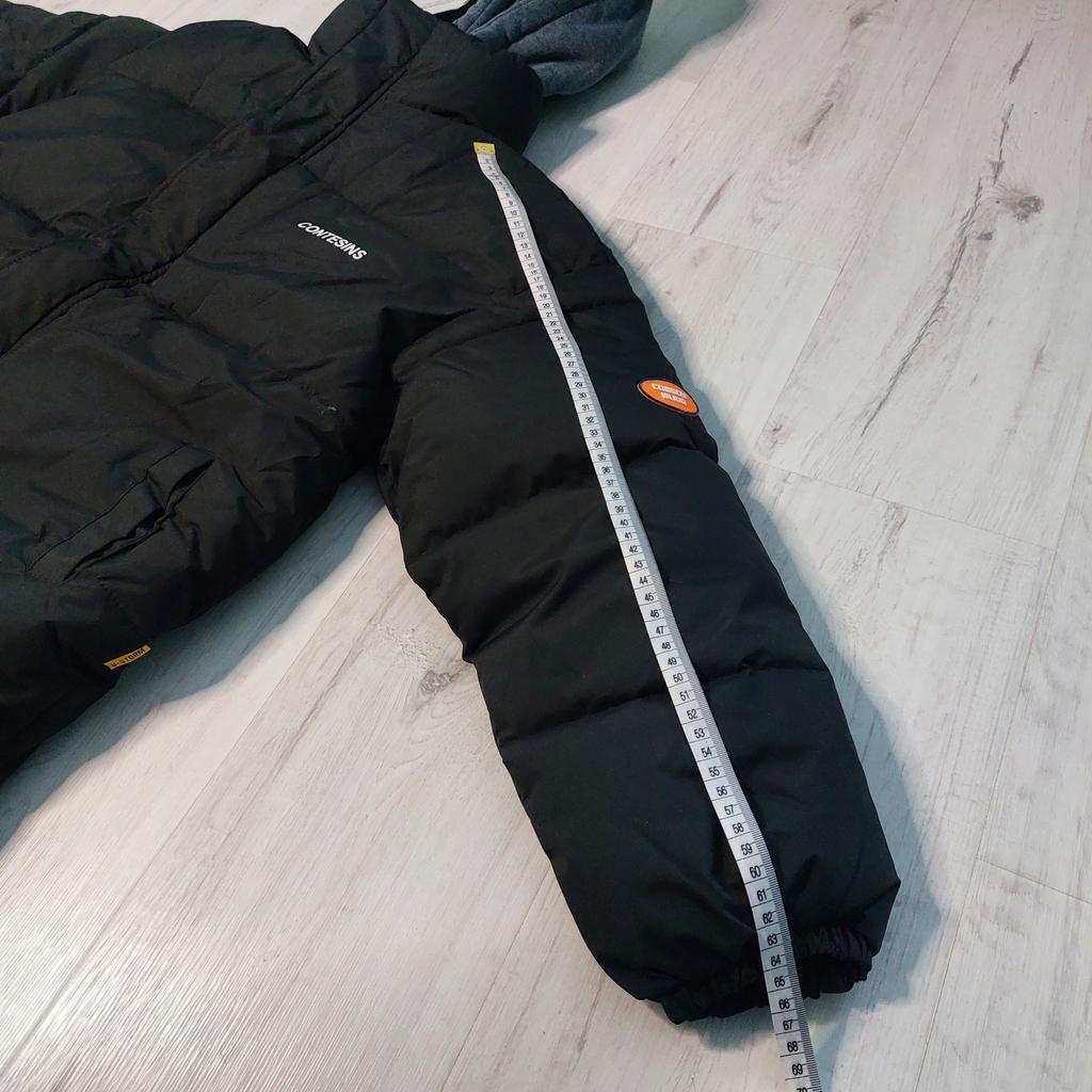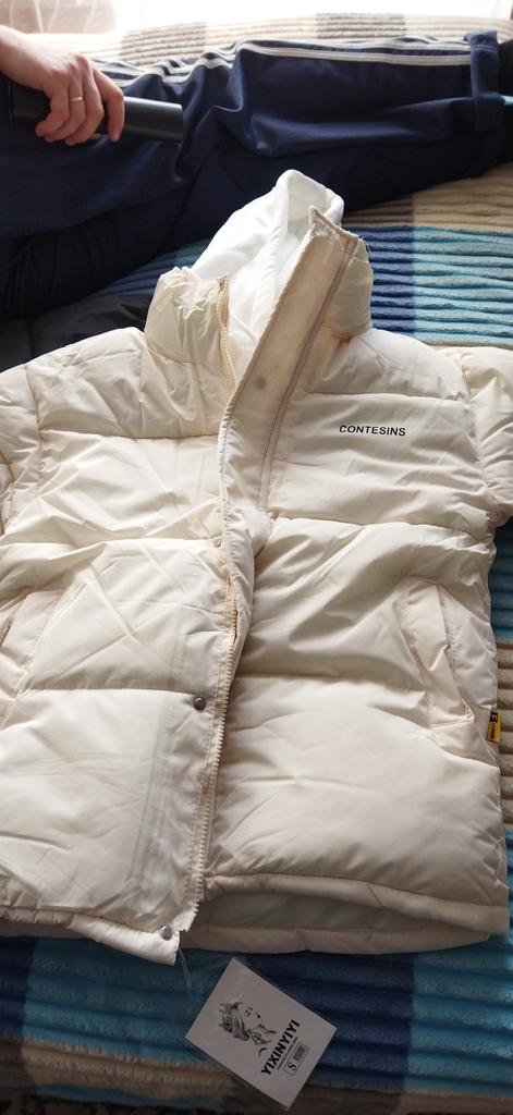 The chest volume does not match, the actual size for this size is 114. Inside, the white fabric is all covered in yellow stains. In black spots from fingers. There are also yellow spots on the hood. There are large stains on the back of the jacket.