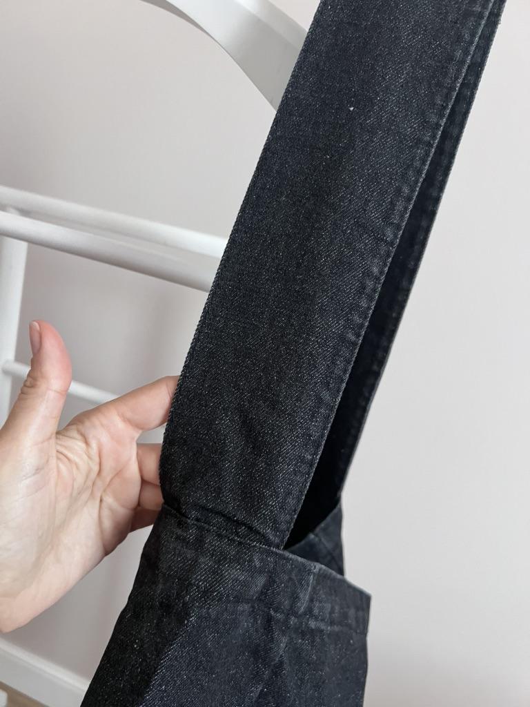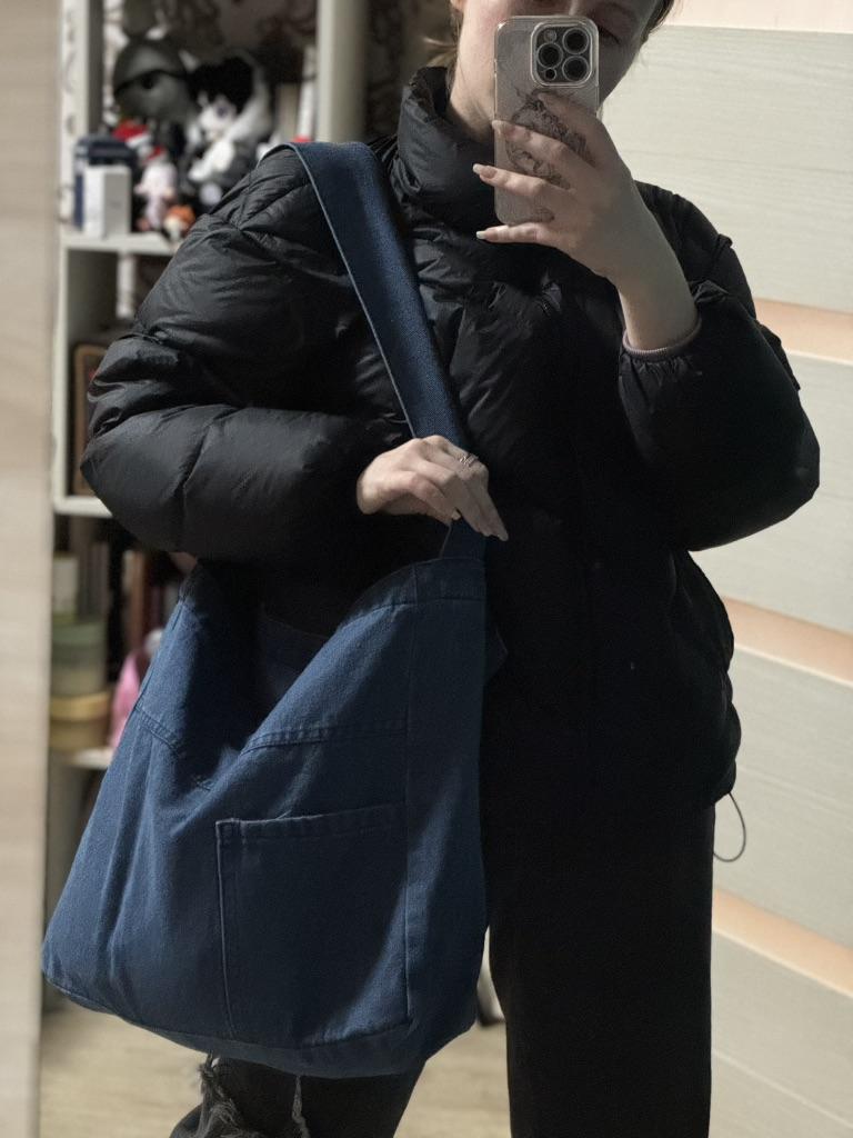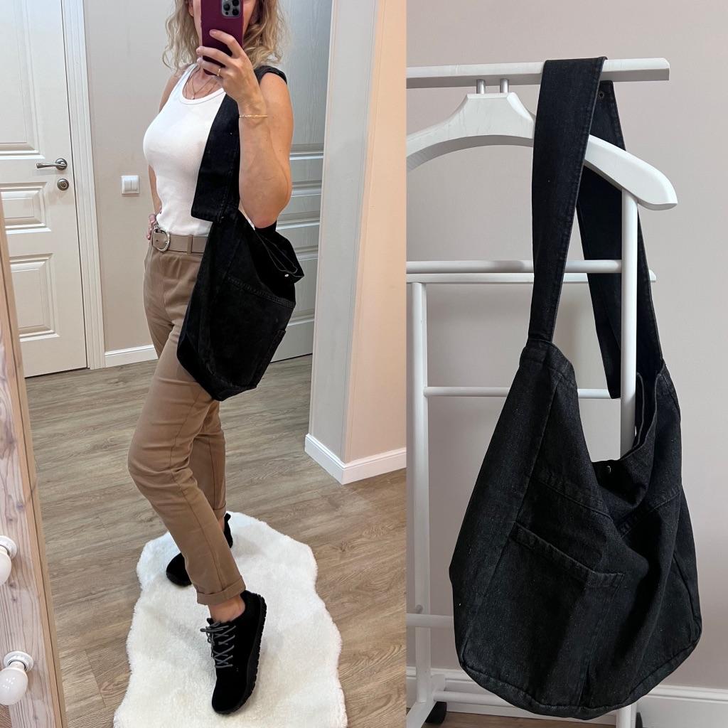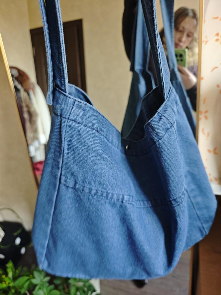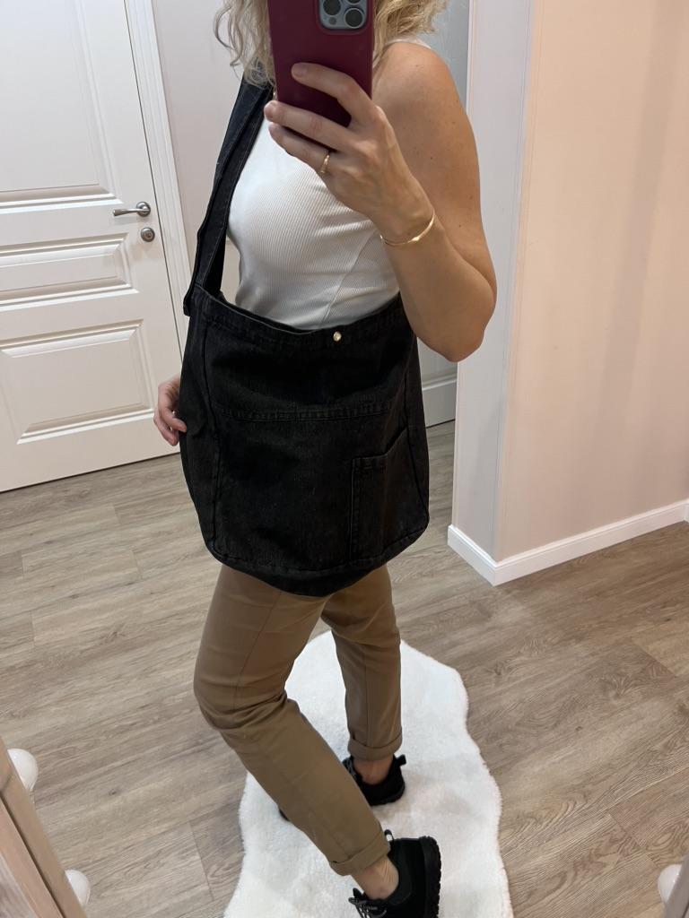 Denim shopper bag. There are two colors in the link - like mine and blue. The bag is made of denim fabric. There is a wide shoulder strap with snaps. Inside the product is unlined, one compartment. There is one pocket on the outside. Button closure. Denim of good density, durable. Shoulder strap, comfortable. A lot of things can fit. That's exactly the kind of bag I needed. So, bagπ€