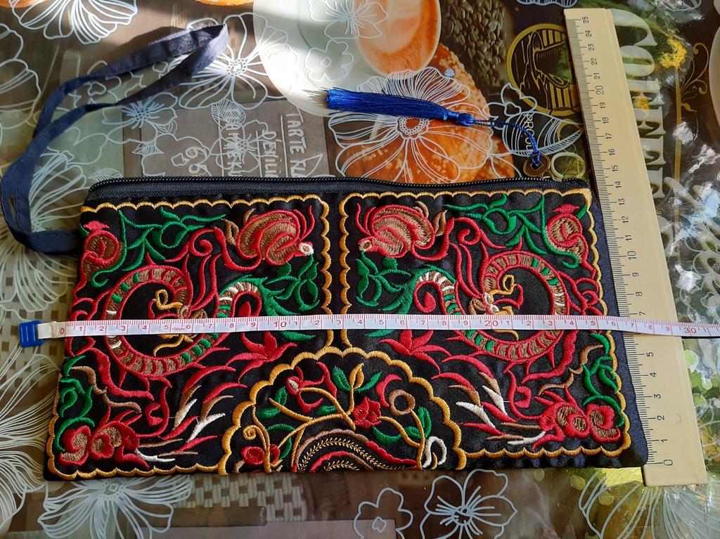 The cosmetic bag corresponds to the specified sizes, there are 2 compartments inside, very beautiful satin stitch embroidery. I recommend
