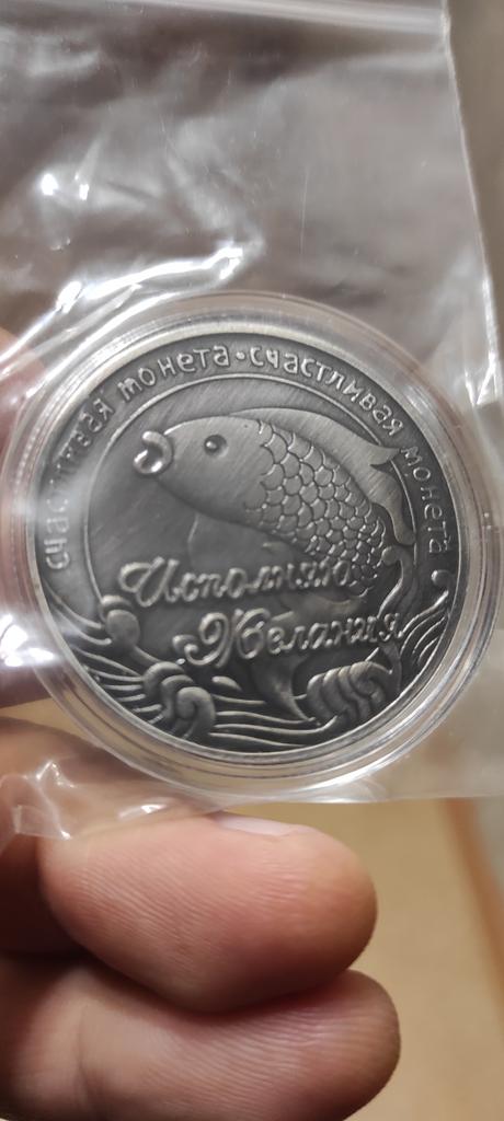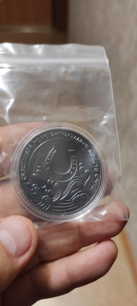 Lucky coin 🪙 I ordered it for my son, he is delighted 🤩 Coin of excellent quality. On one side there is a carp with the inscription “I make wishes come true.” On the other - a horseshoe. At the top is the inscription "Lucky Coin". Three-dimensional drawing, relief. The size is quite impressive - about 2.5 cm. Made from zinc alloy. It was packed in a plastic round box.