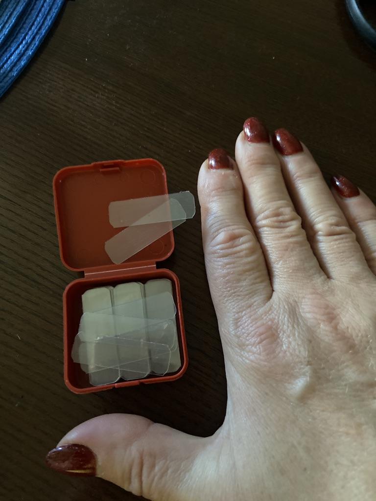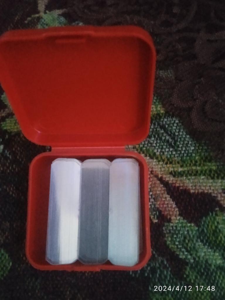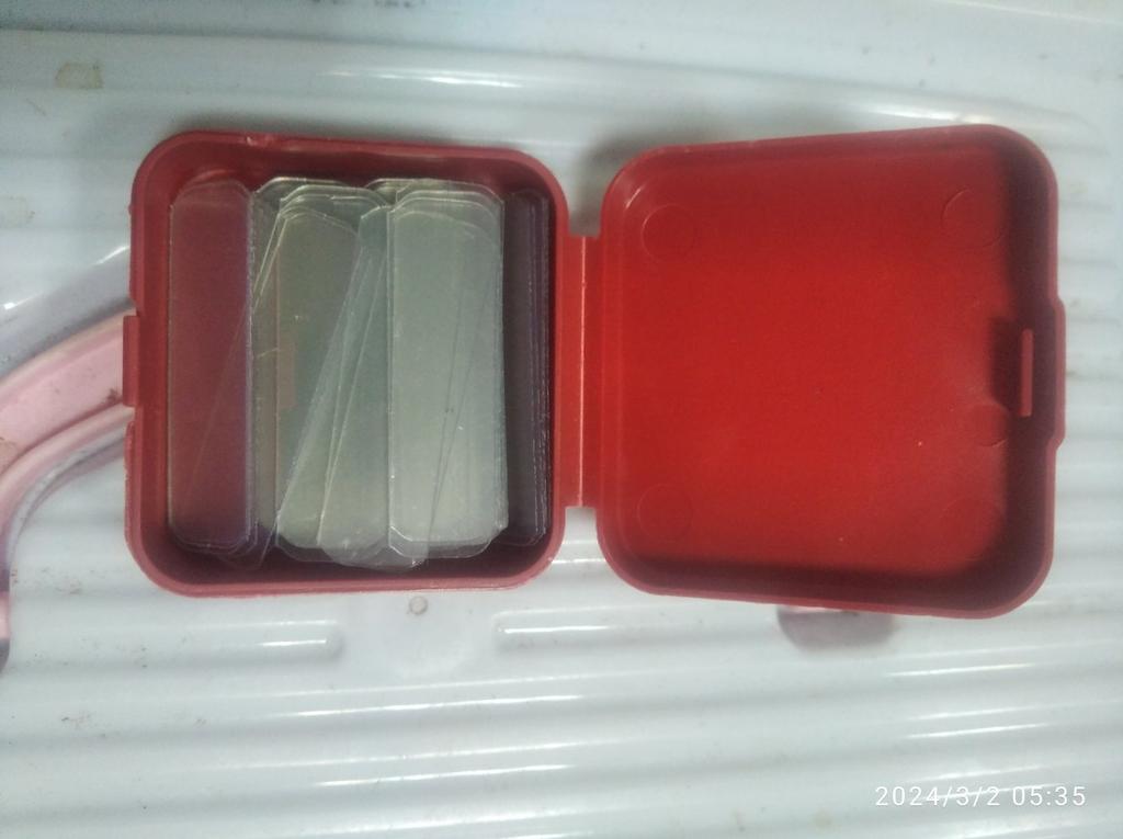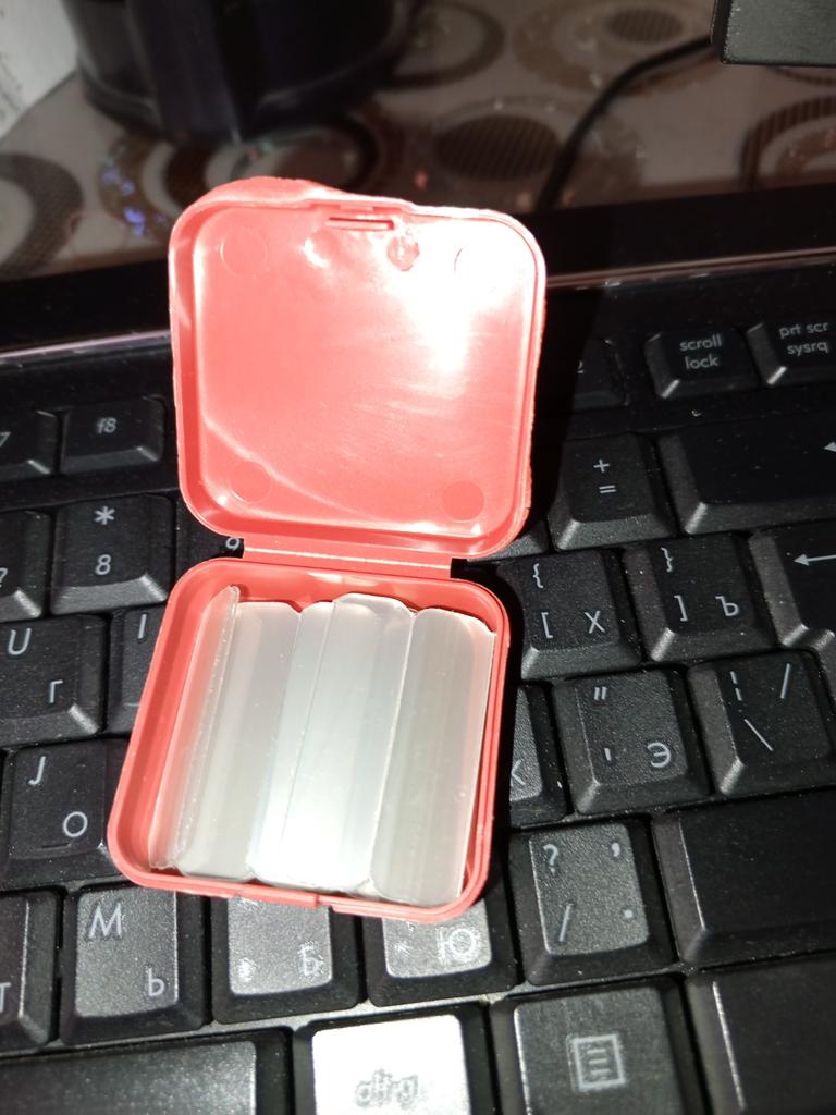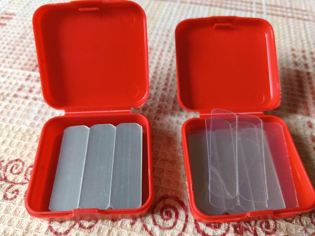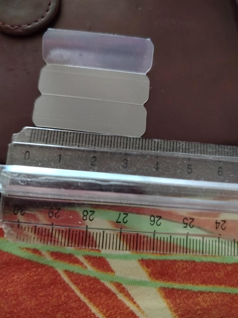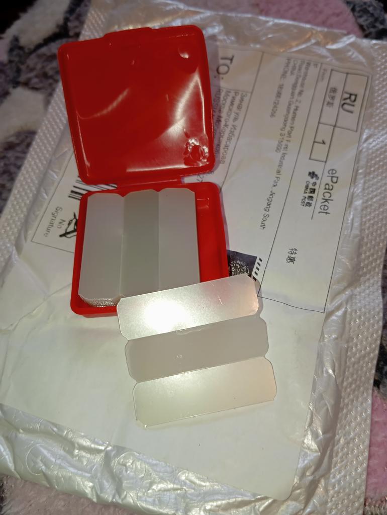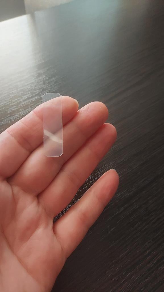 The size of the plates is 4 times smaller than in the photo - 1 phalanx in length and half a phalanx in the width of a thin little finger. How to attach them? These are pieces - scraps of thin transparent plastic. There is no adhesive backing.
