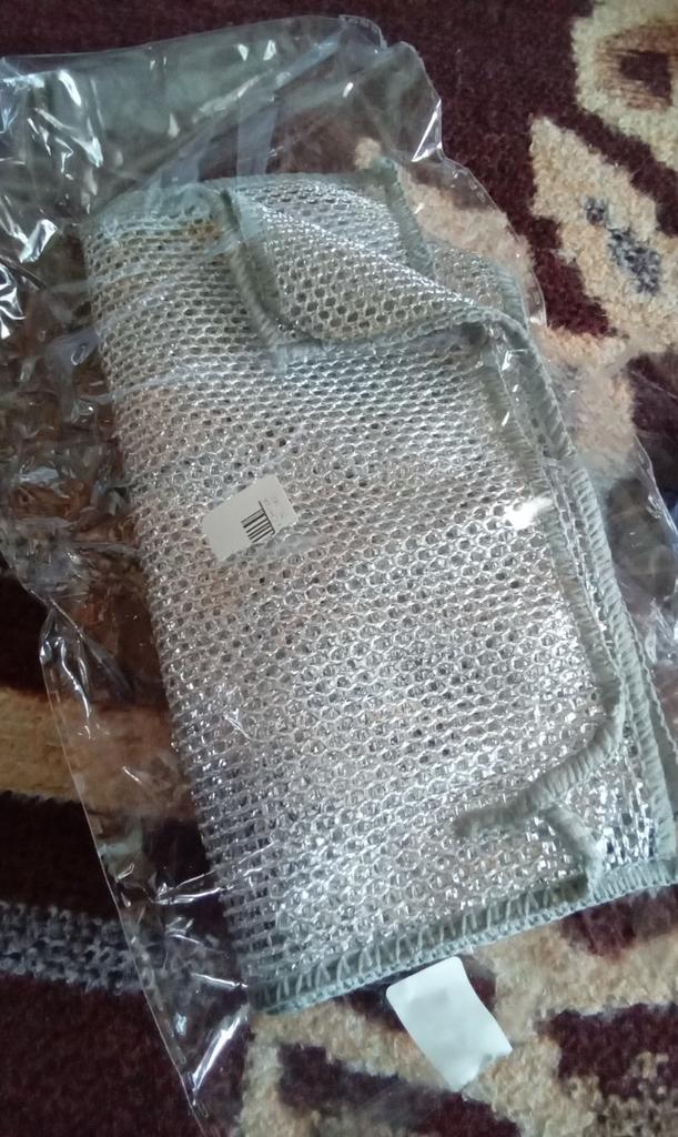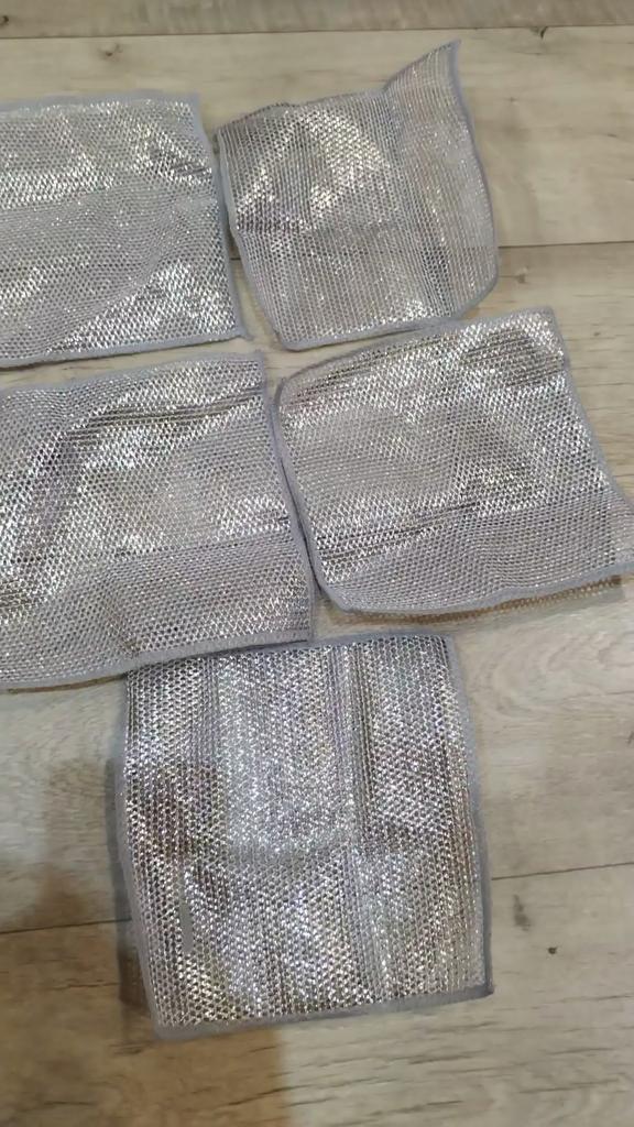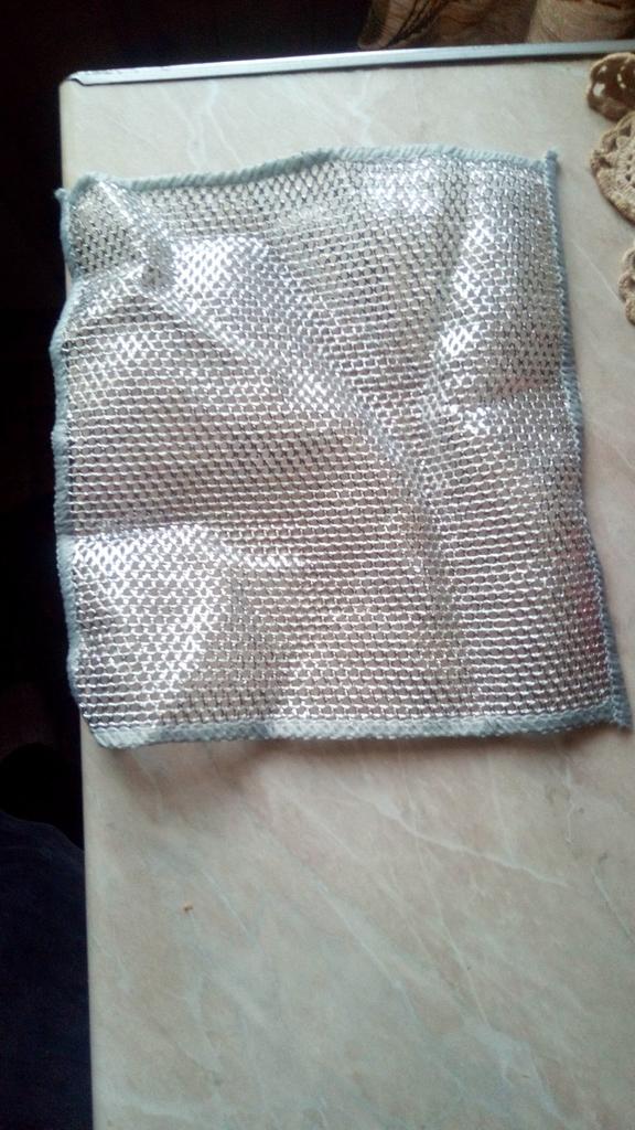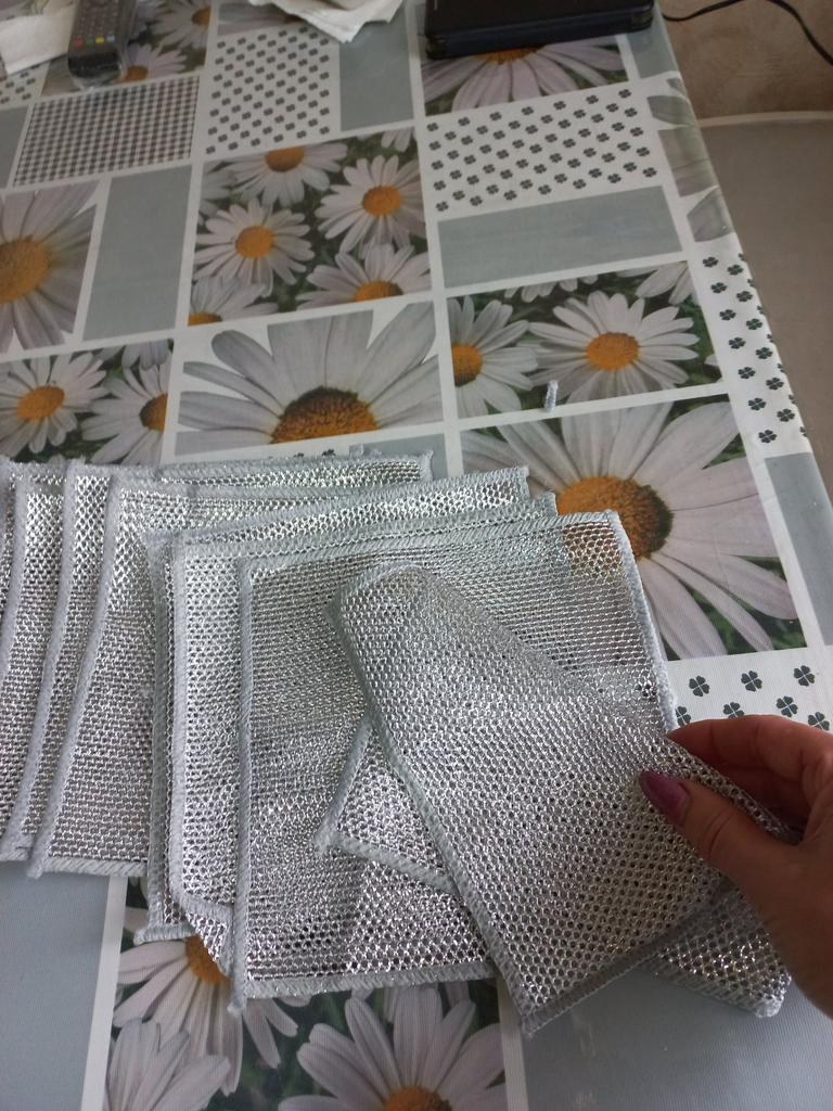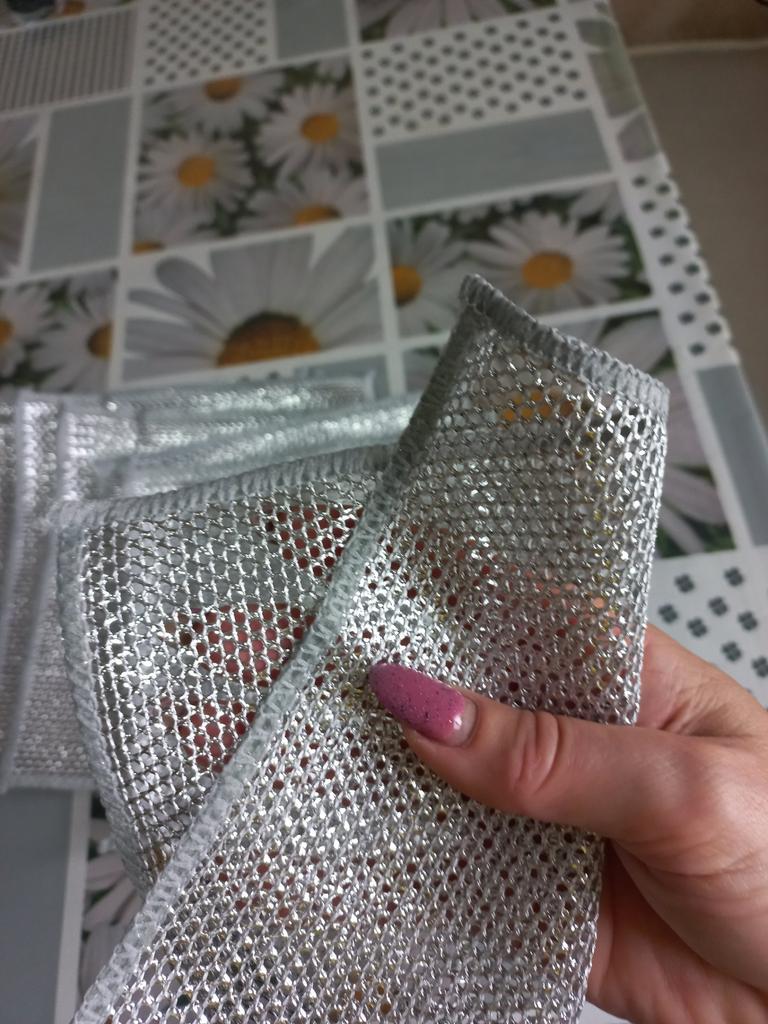 The napkins are knitted as if from New Year's tinsel. I will not use them for washing dishes, they are too soft, there is no metal. I will use them in patchwork as outer pockets in cosmetic bags.