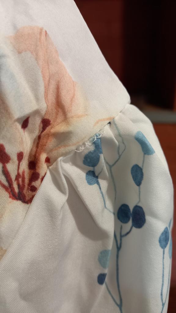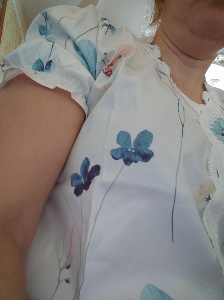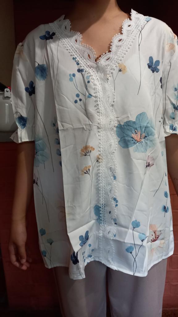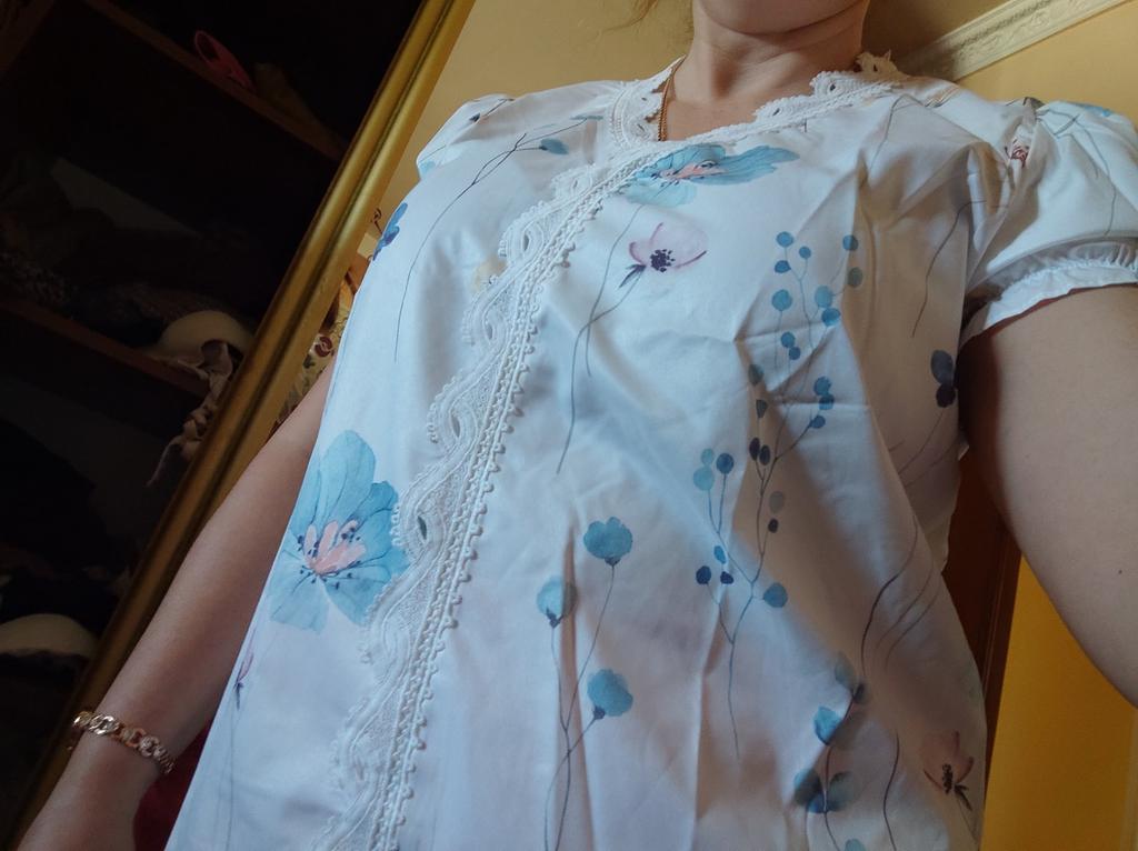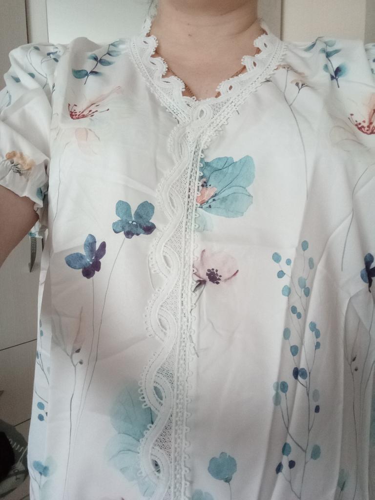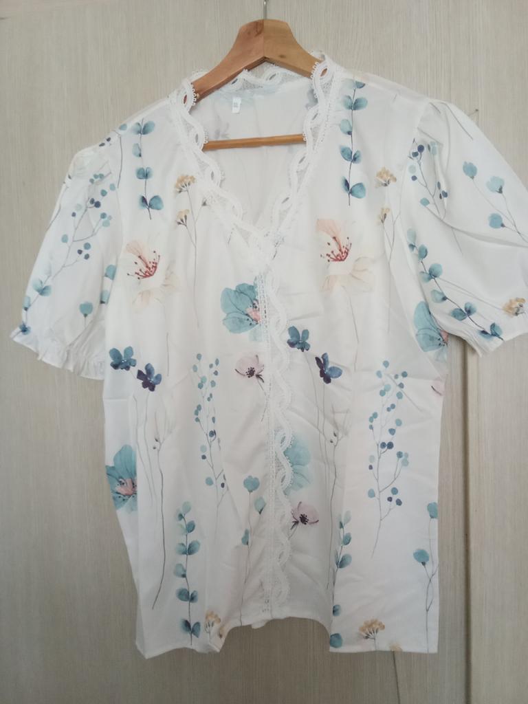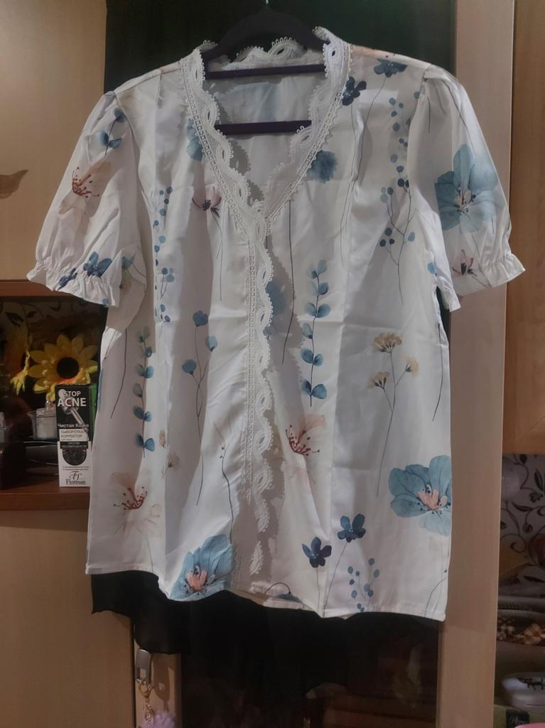 The material from which the blouse is made is so chemical that it will be impossible to wear it in the summer. The volume of the bust and hips of the blouse is large, it is not XL. It looks attractive in the picture, but in life it’s somehow too cheap and old-fashioned, especially the sleeve with a gather at the bottom, trimmed with lace