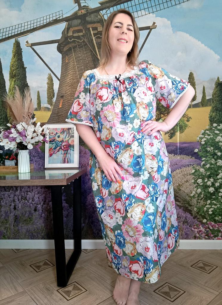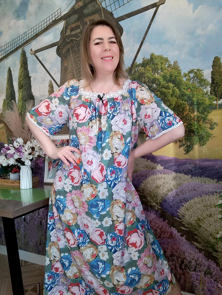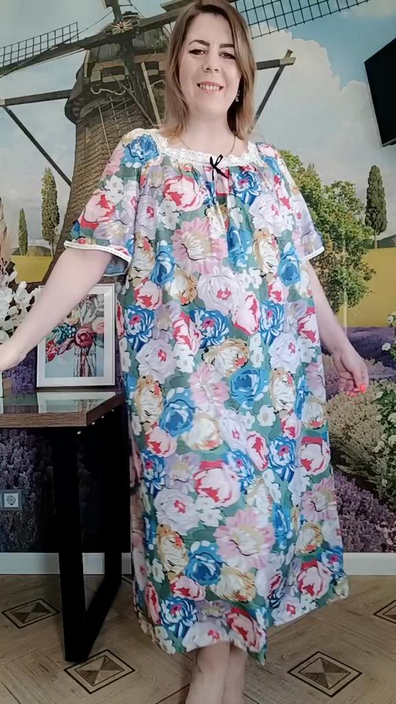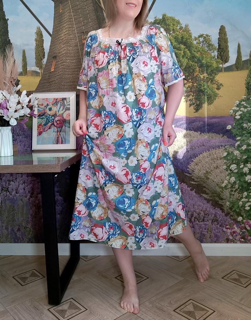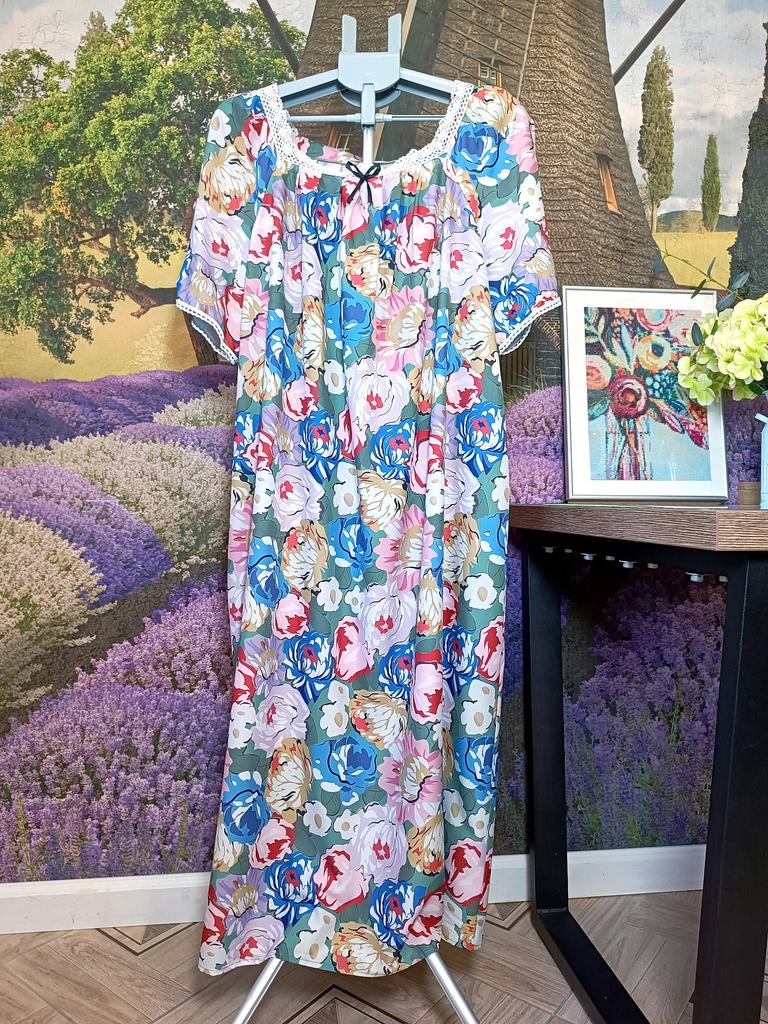 Women's Home Wear Pajama Set - V-neck Lace Patchwork Printed Short-sleeved Long Dress Pajama Set