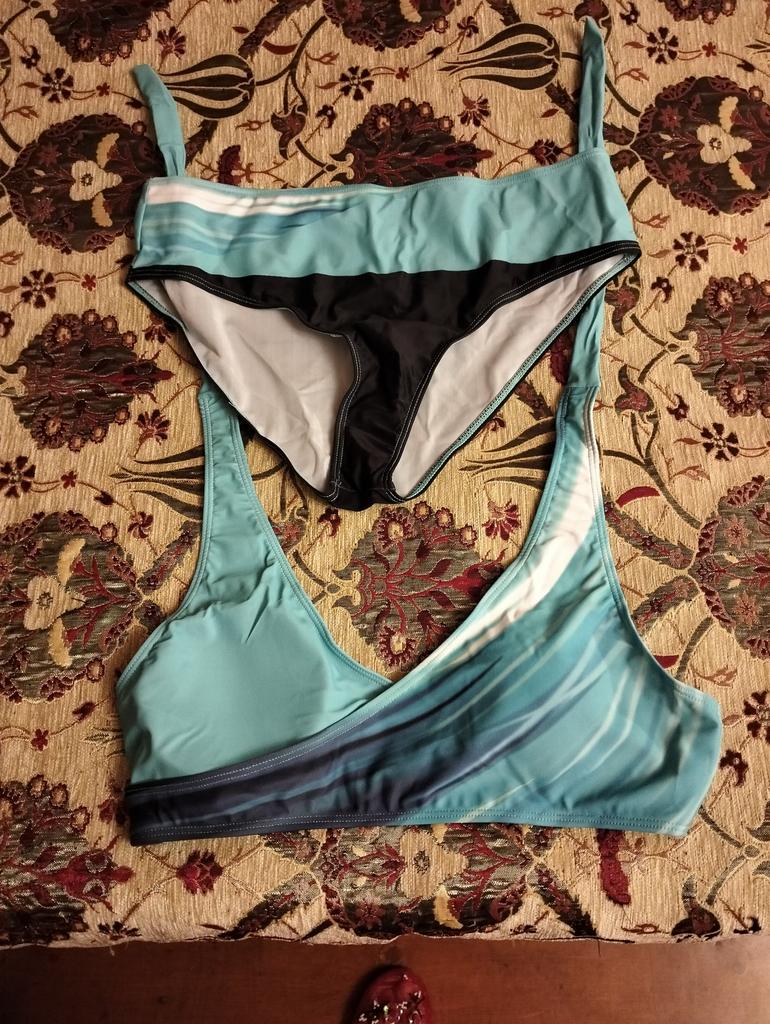 The swimsuit arrived, but it's a completely different model than in the picture. Instead of a regular bra with straps, there are ties here. And the color isn't as bright. But otherwise, in principle, the quality is not bad.
