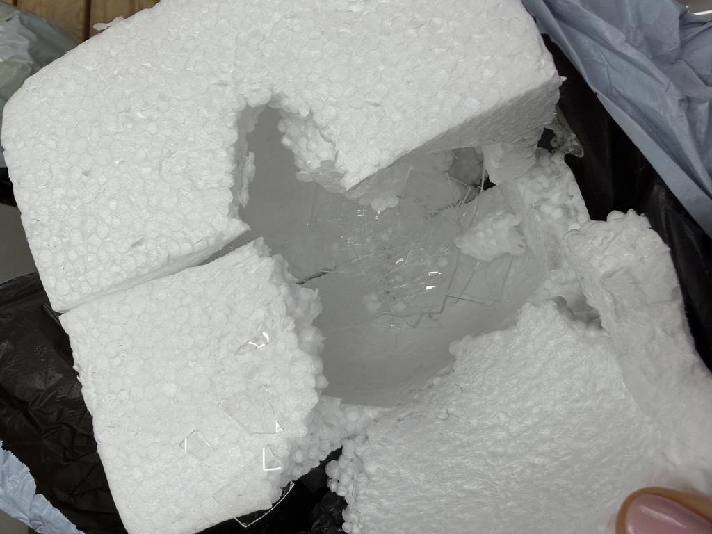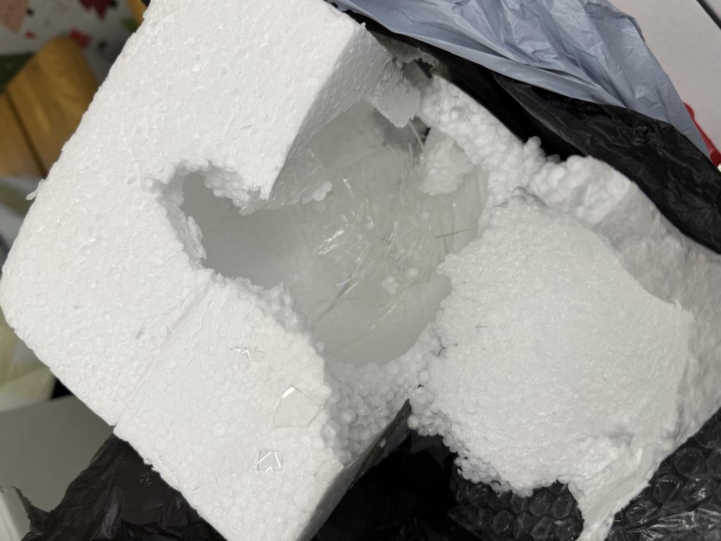 I am actually surprised that sender thought that it will come in one piece. How someone can pack glass into thin box of styrofoam and plastic bag and hope that it won’t break. I think that product was nice but I didn’t have chance to see it