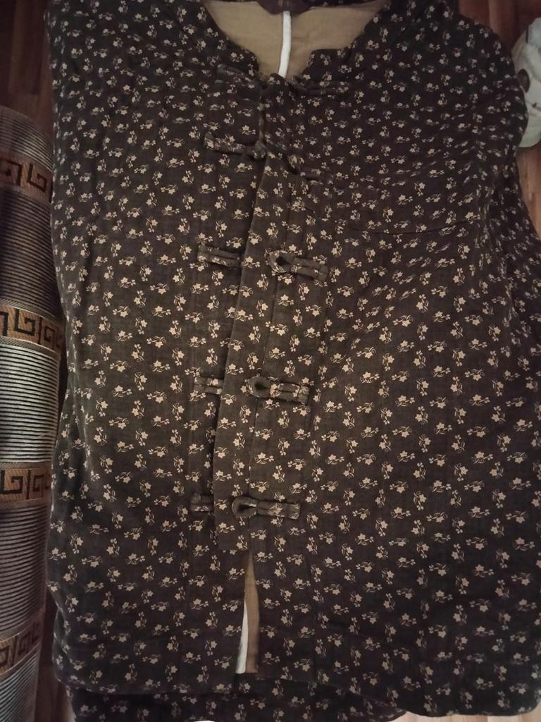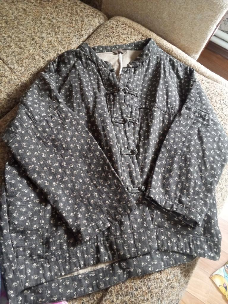 Interesting jacket, unusual. Color brown. Natural fabric. Fits perfectly. Thank you very much!