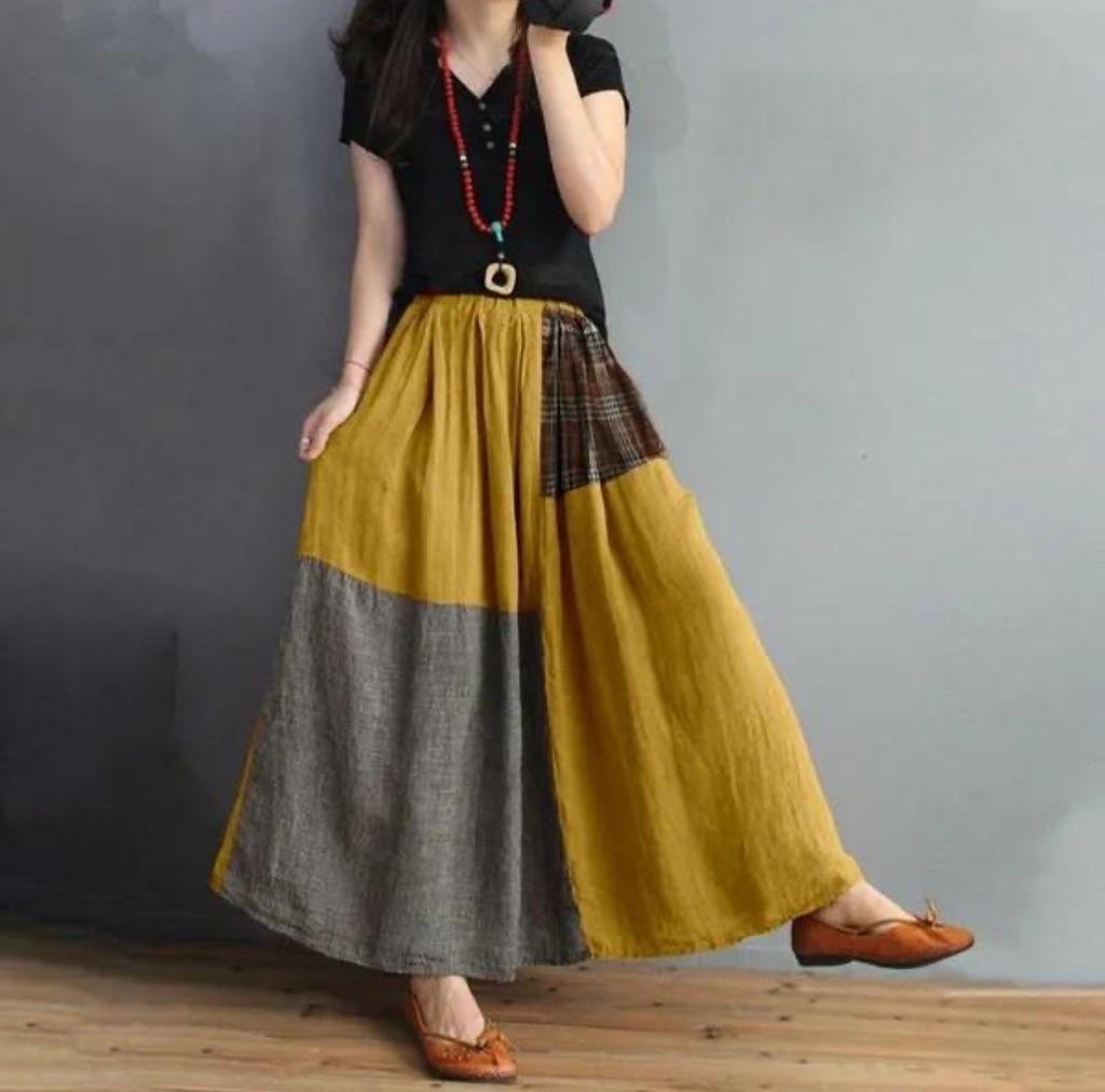 Spring and Summer Retro Literary Style Loose Elastic Waist Colorblocking Cotton Half-body Skirt Thin A-line Skirt