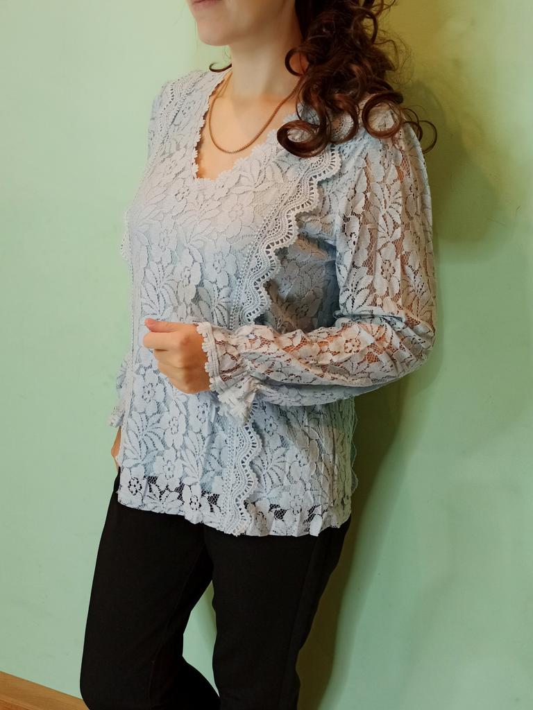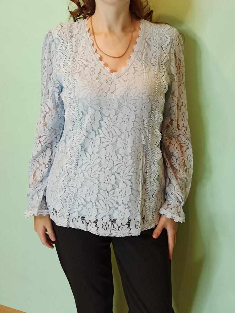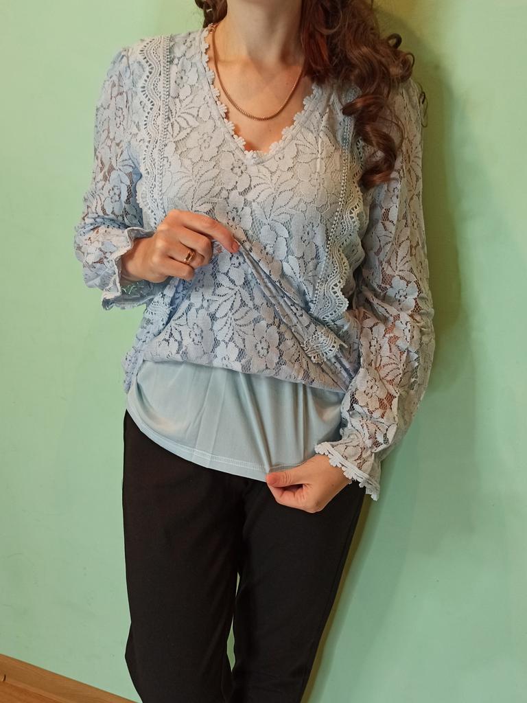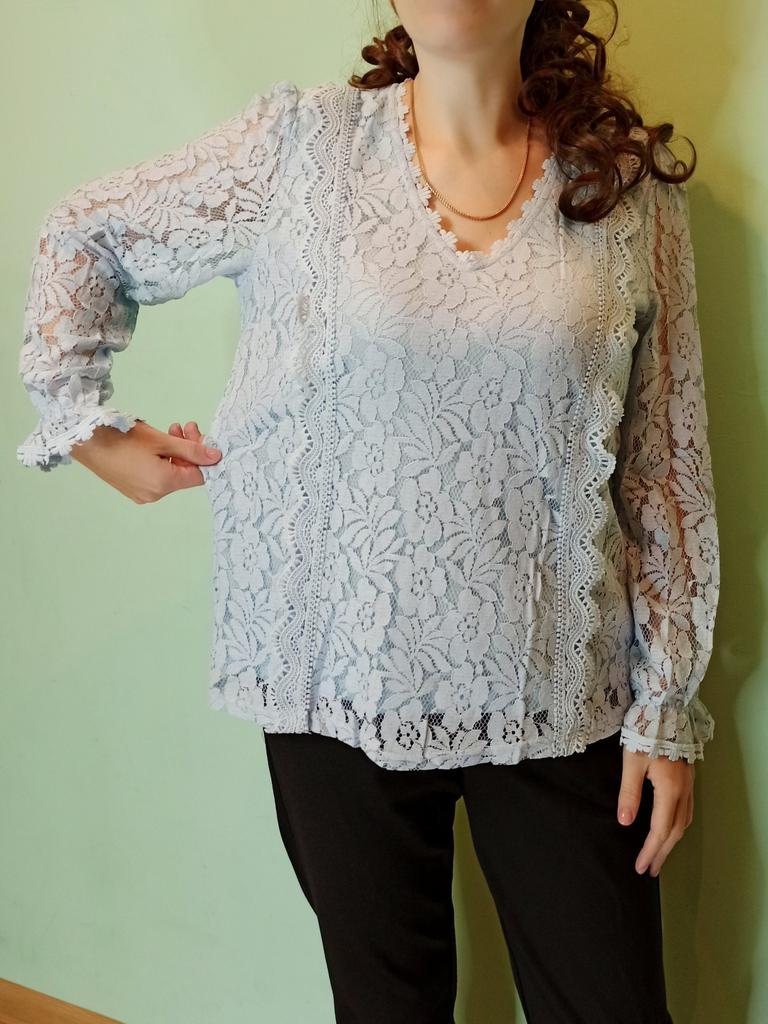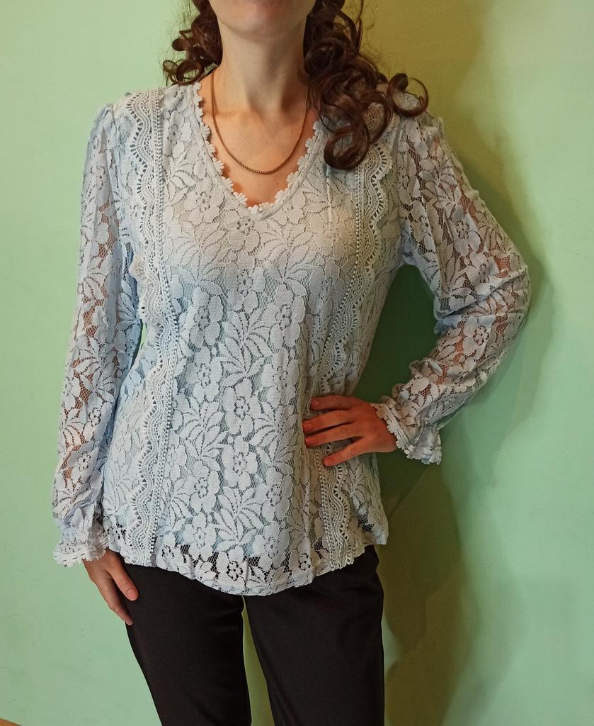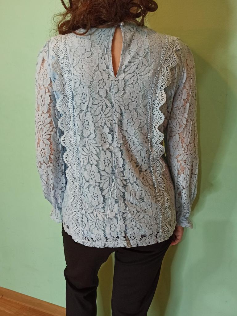 Blouse for women ✨ Long-sleeved blouse for spring/autumn. The sleeves are openwork, made of floral lace, so they are cool and perfect for transitional seasons. I ordered it in sky blue but the seller has several color options available and they are all very beautiful. The size corresponds to the measurements shown in the advertisement. It arrived in less than a month with a tracking number until delivery.