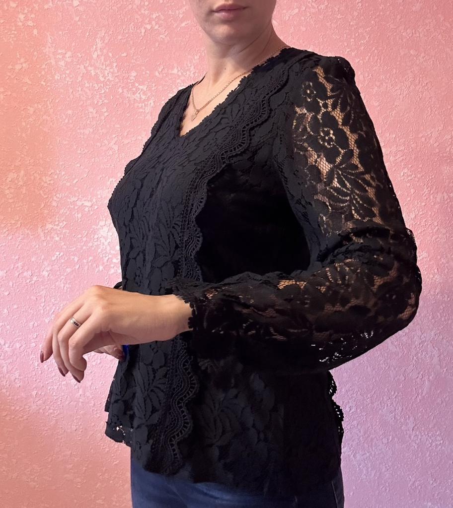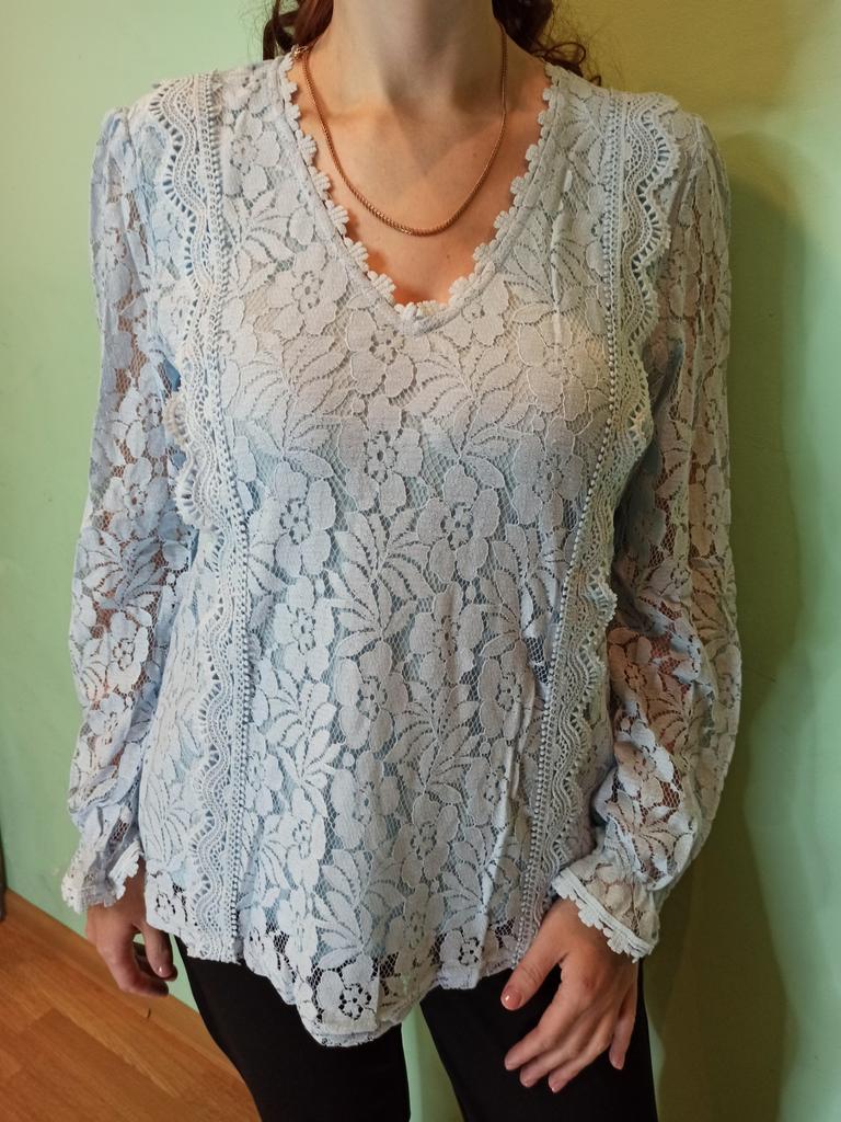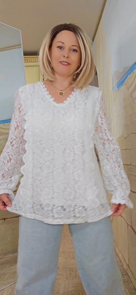 Knitted lace blouse with princess sleeve This shirt is simply stunning! It perfectly combines a sexy and elegant look. The hollow lace adds a feminine and delicate touch, and the fitted cut flatters the body's lines without being constricting.. The V-neck adds extra chic, and the princess-style sleeves make the shirt very special – not something you see every day. Suitable both for evening outings and for combining with jeans or a skirt for everyday wear.. The fabric feels pleasant, high-quality, and the shirt keeps its shape even after hand washing.. Highly recommend for those looking for a delicate but full of presence look.