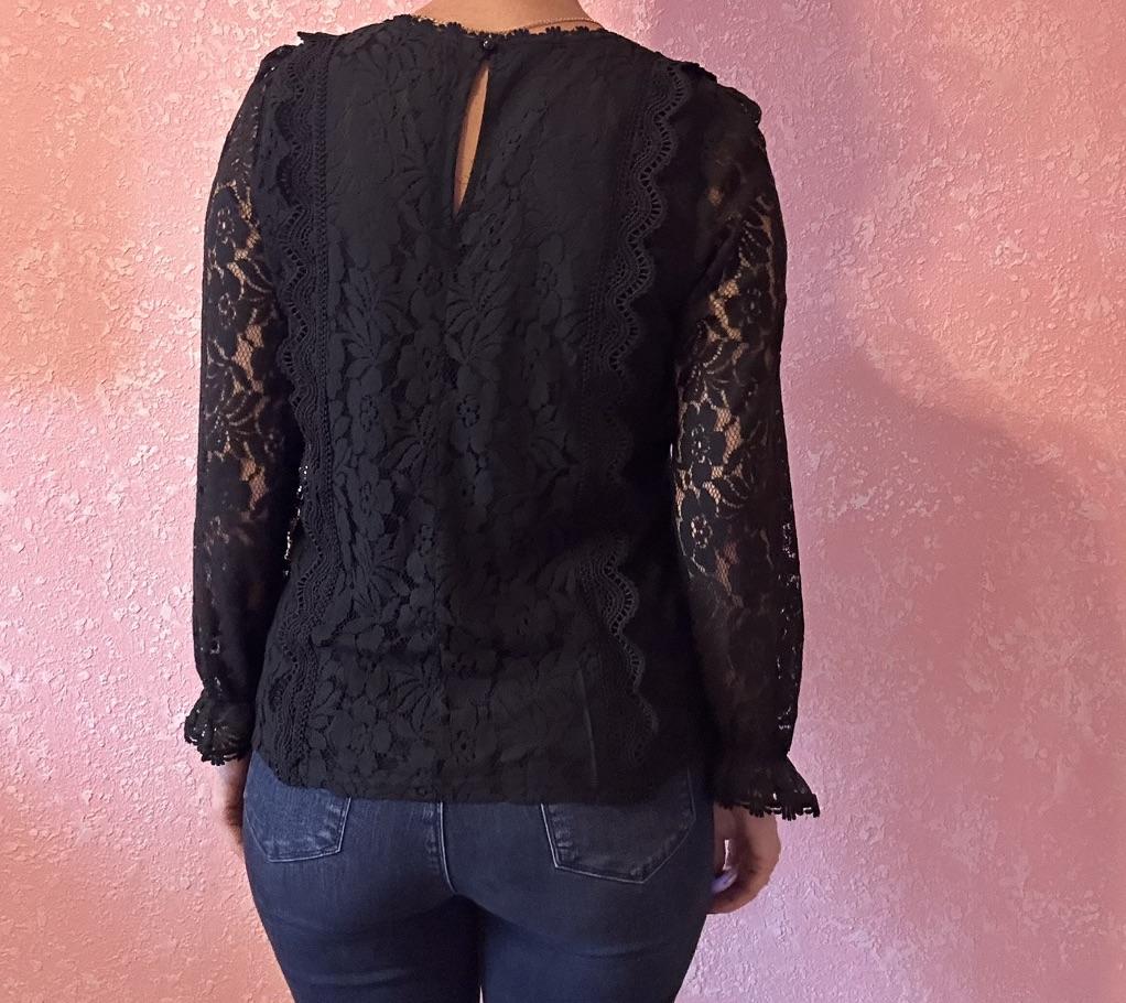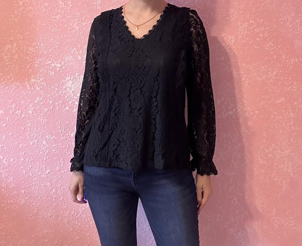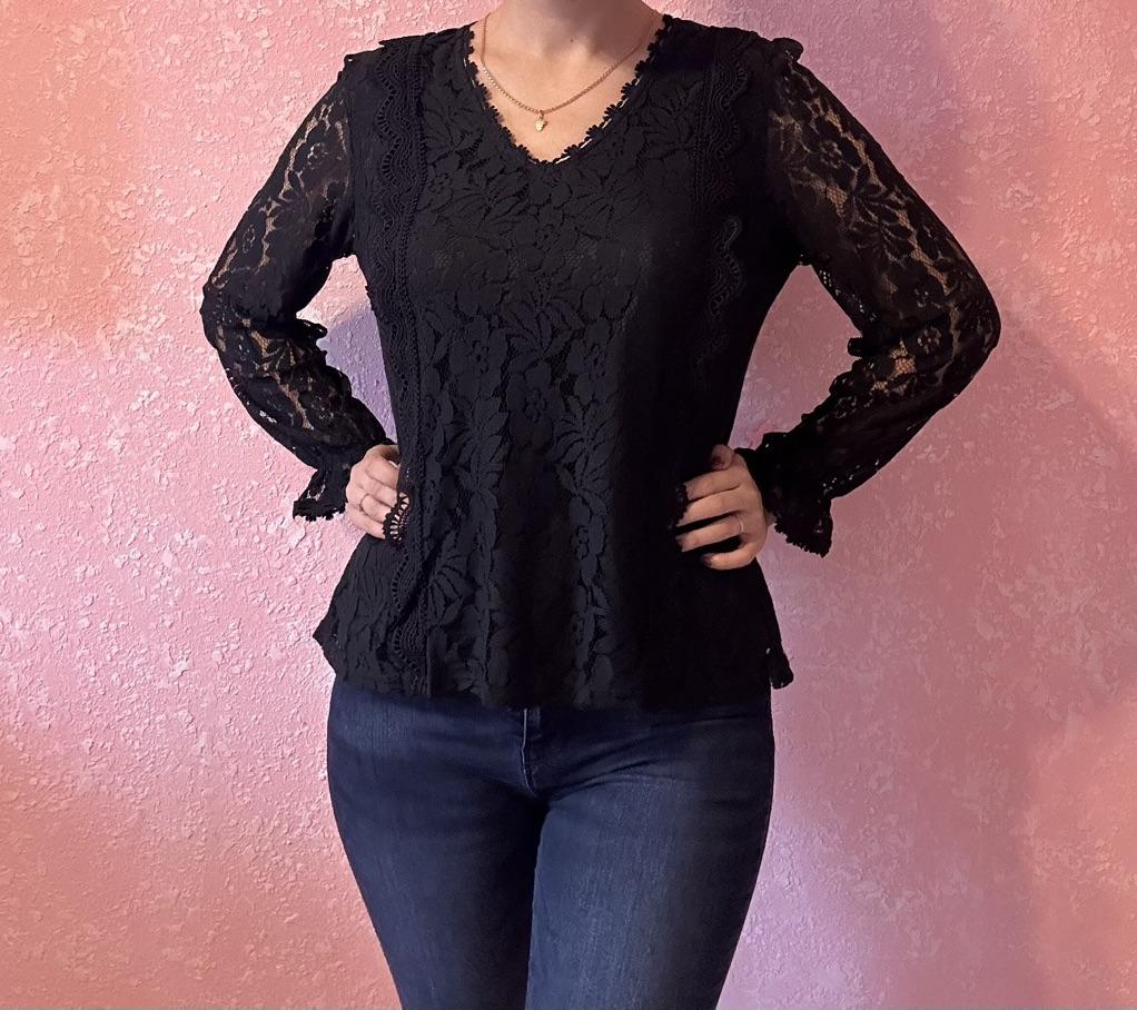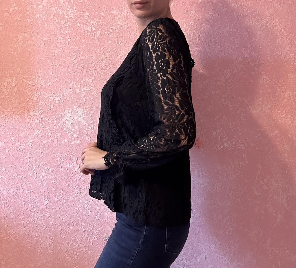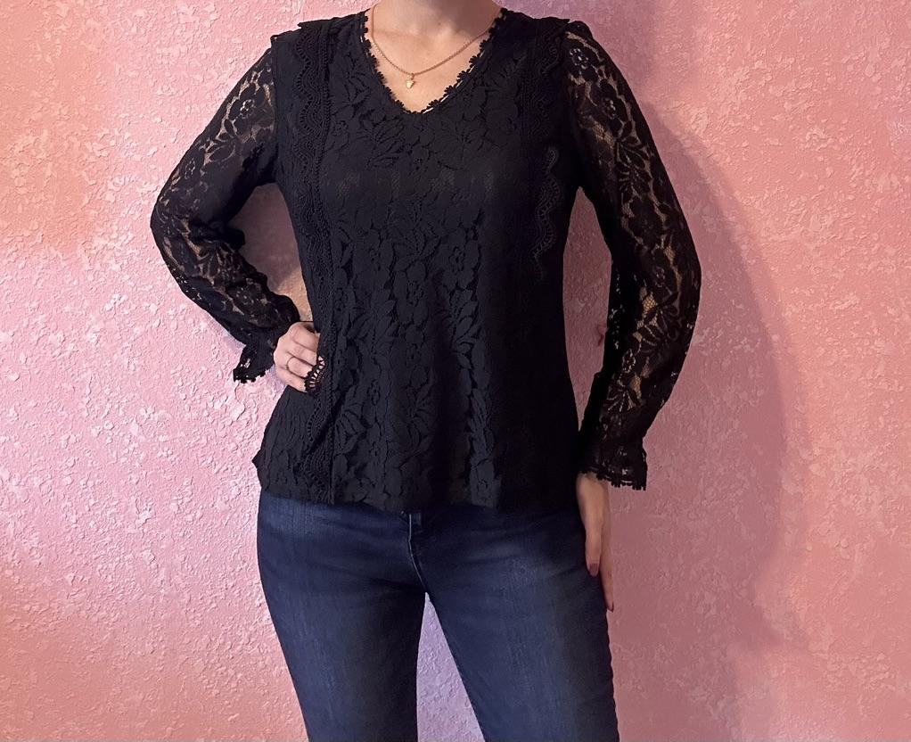 This shirt is simply stunning! It combines a feminine and delicate look with a sexy and elegant touch. The hollow lace gives a romantic feel, and the solid color design maintains a classic and easy-to-combine appearance with other items.. The V-neck is very flattering, and the fitted cut creates a polished and refined look. I especially loved the 'princess' sleeves – they add a delicate volume and a slightly different style than usual.. The fabric (polyester) feels good on the body, is pleasant and doesn't itch, and the shirt fits well – not too clingy but also not too loose.. A beautiful shirt, perfect for going out, dates, or when you simply want to feel feminine and put-together. A perfect upgrade to the wardrobe!