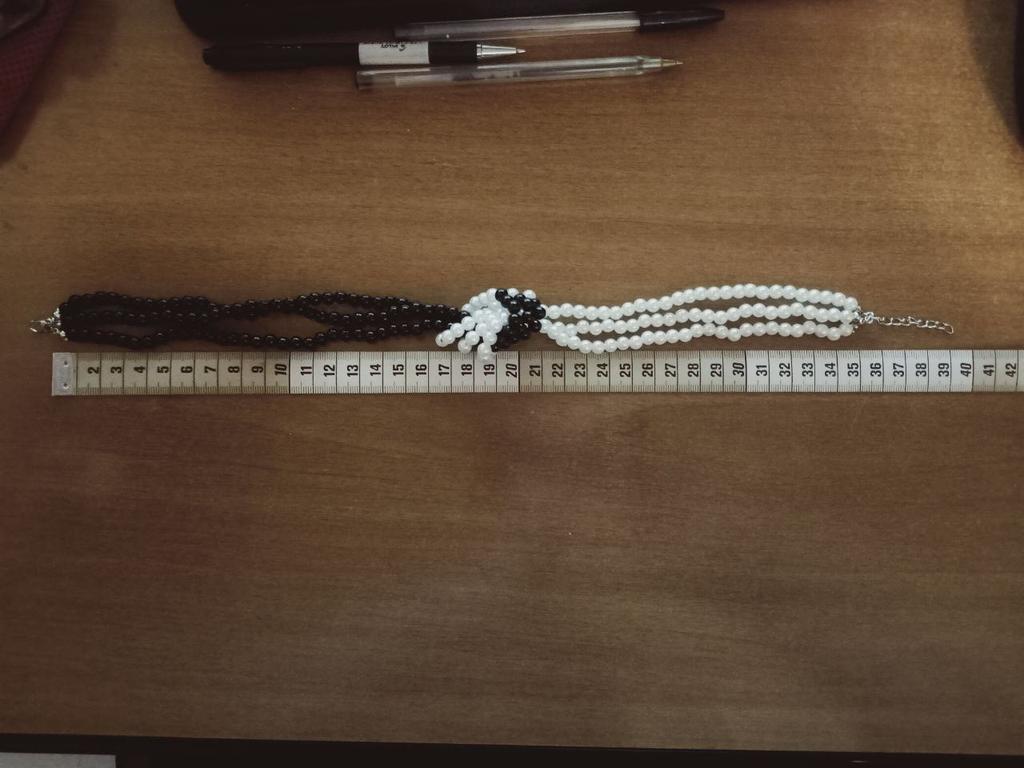 Awful cheap plastic on a thick fishing line, beads with sharp spikes due to paint drips, scratches the neck and does not fit the shape. Does not match the picture!
