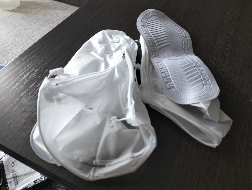 It's still unclear how this footwear will behave in the rain. It looks cool, you can put it on regular shoes. To avoid problems when putting it on, it's better to place the footwear first, and then put on the shoes.