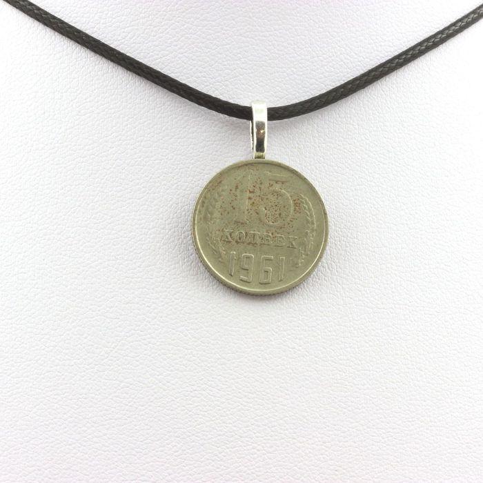 Pierres et Minéraux. Collier pièce de monnaie URSS 15 kopecks. Cordon noir.