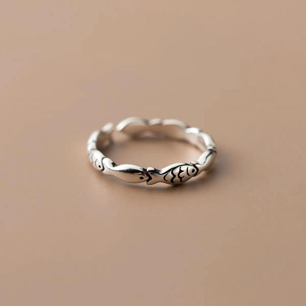 S925 Retro Thai Silver Fish Ring, Adjustable Japanese-Style Fashion Jewelry