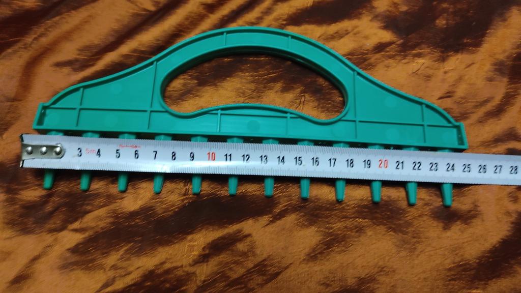 1. Actual size 25*11*2.9 cm (promised 29.5*13*2.9). 2. The tool is useless in the garden bed. I couldn't make holes with it - the tines are too small. Well, maybe only for making holes in wet sand.