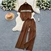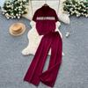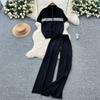Summer Women Drawstring Knitted Sweater Trouser Two Piece Set Short Sleeve Zipper Pullover Tops and Wide Leg Pant Suit