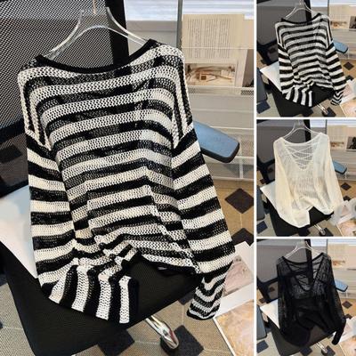 Spring Summer Hollow Knitted Sweater with Knitted Stripes Loose Long Sleeved Sunscreen Cover Thin Top