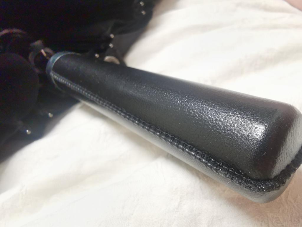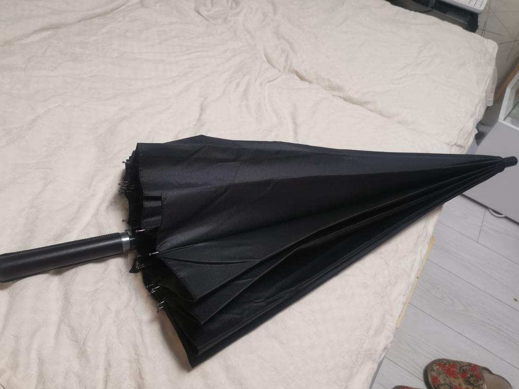 The umbrella is good, although a bit heavy. The strap that fastens the canopy when closed is a button, not Velcro. The handle looks like it's made of leather, but you can't tell anything about the material by touch, as the handle is also wrapped in clear cellophane. Overall, a quite acceptable umbrella.