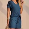 Summer Women's Tracksuit Short Sets Short Sleeve Pullover V-neck Tops High Waist Straight Pants Pockets Drawstring Button Casual Two-piece Set