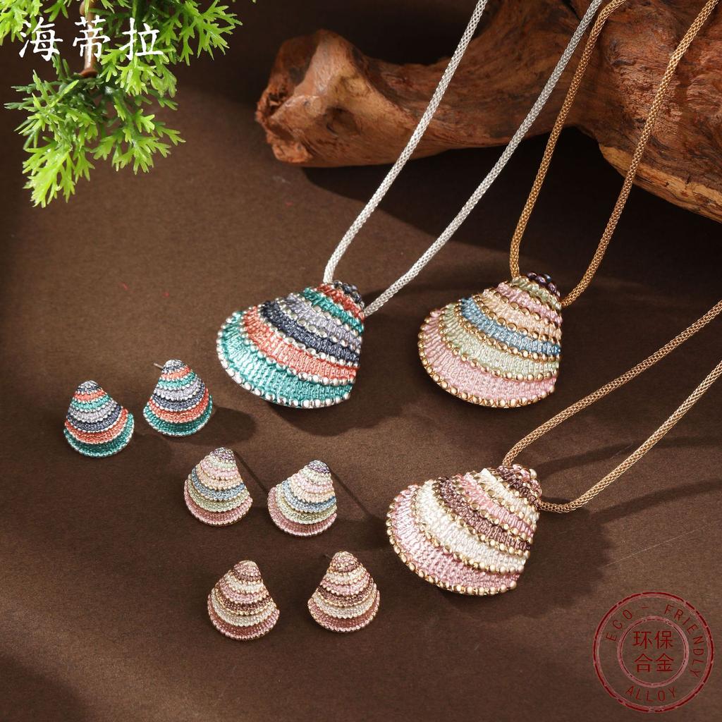 Enamel Color Geometric Shell Stud Earrings Pendant Set, Women's Simple and High-end Shell Necklace