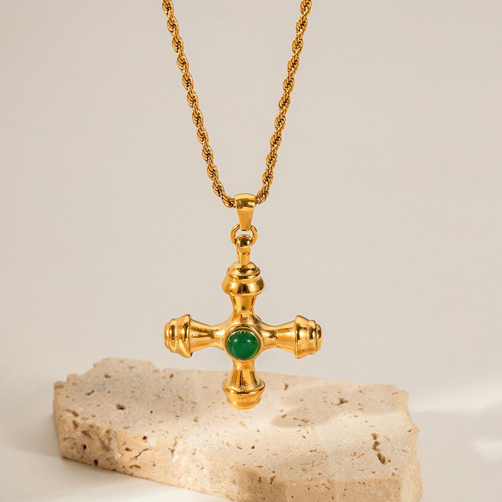 18K Gold Plated Minimalistic Cross Pattern Design Tarnishproof Stainless Steel Inlay Natural Stone Pendant Charm Lady Necklace