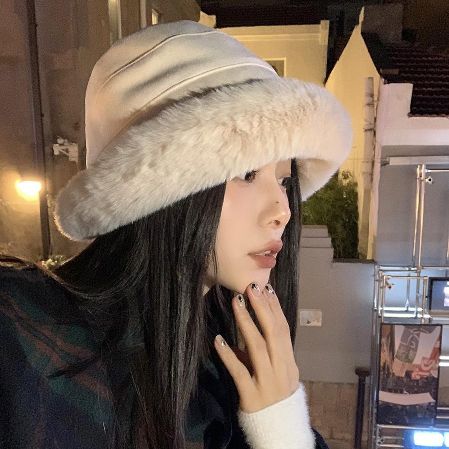 Hairy Hat Women's Winter Hemming Bucket Hat Warm Ear Protector Piled Thickened Big Head Circumference Suede Basin Hat