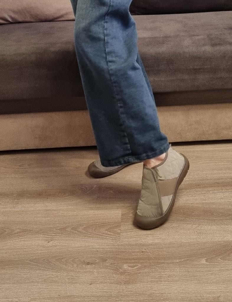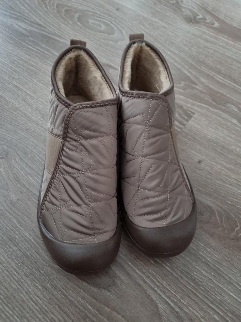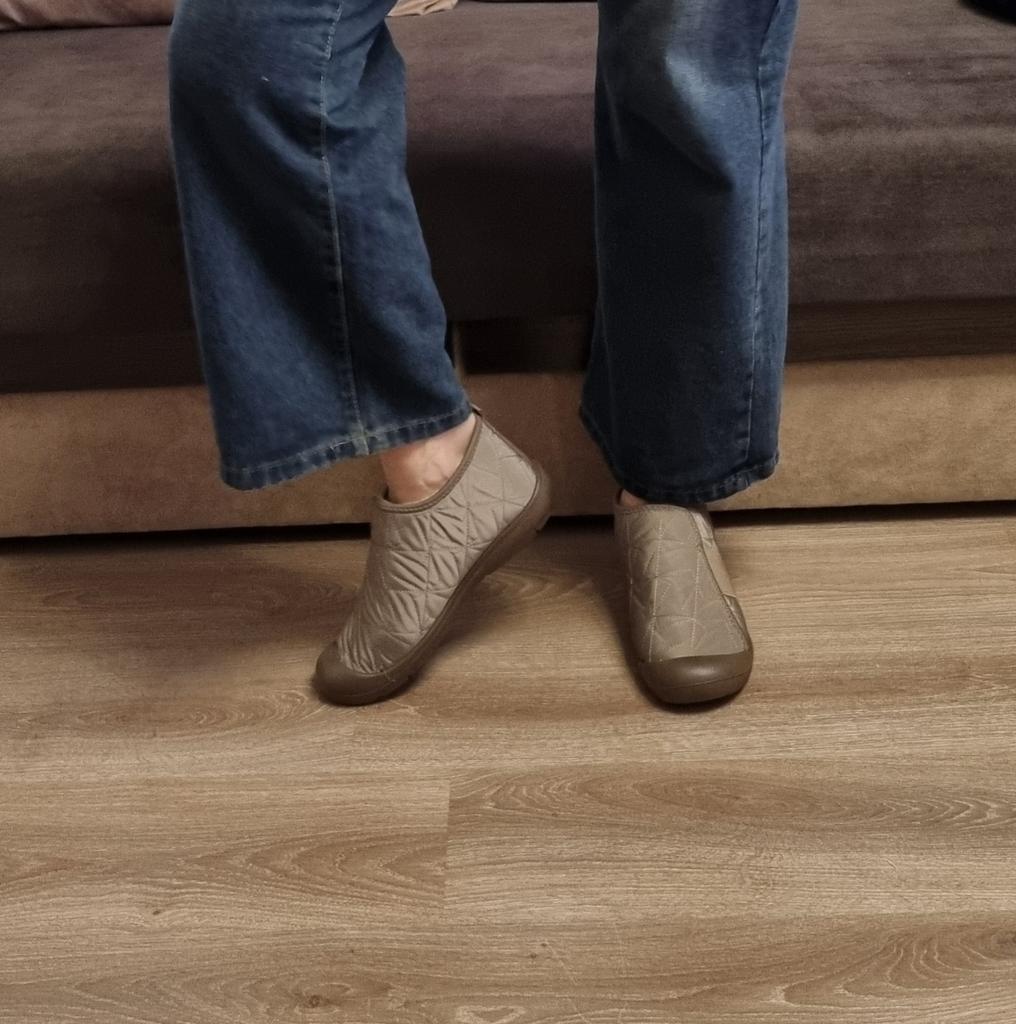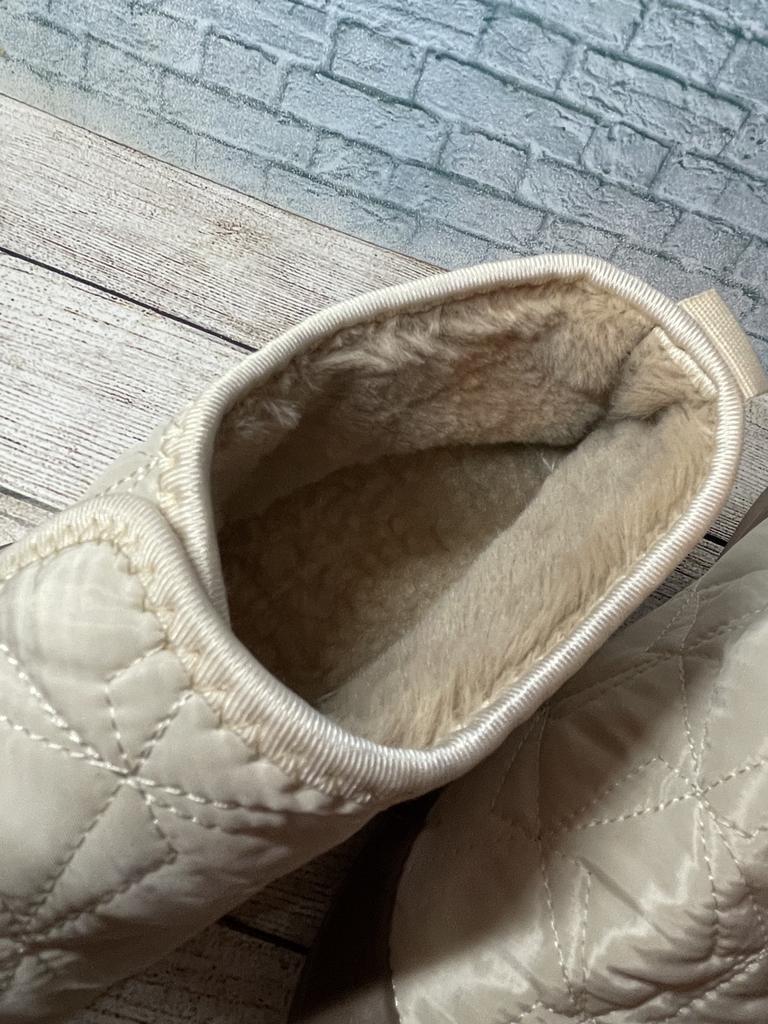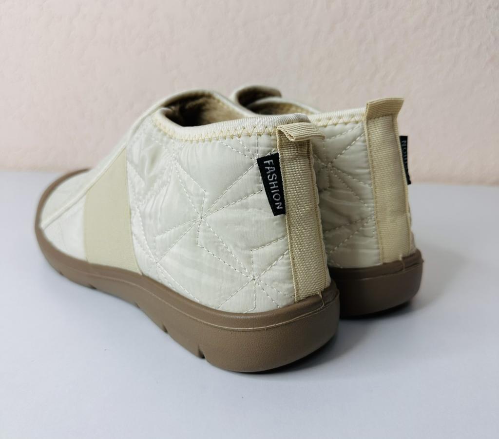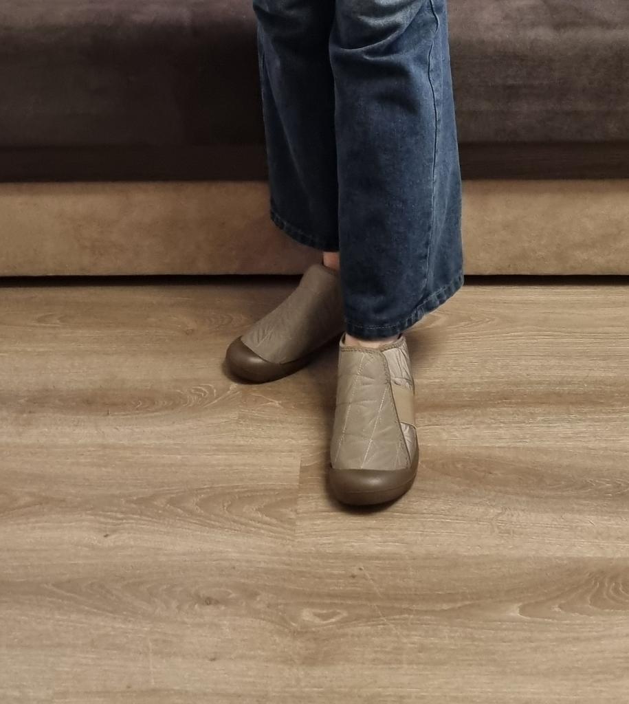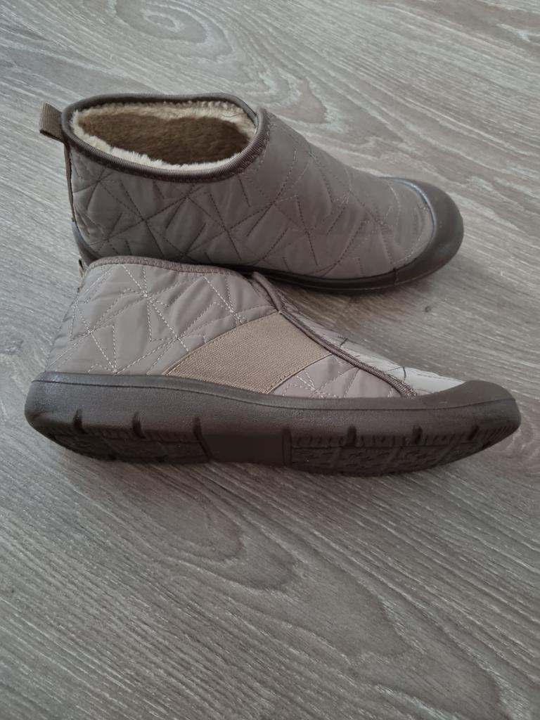 Wonderful soft bootsβΊοΈ Cozy, with short soft fur inside, they are very comfortable. Those who don't like stiff shoes, need foot comfort, they will definitely suit! The tailoring is factory-made, neat, without odor. Upper - quilted raincoat fabric, like a jacket, sole is flexible. The color is very pleasant, chocolate sole and a beautiful beige upper. Lightweight, fur insole, removable. size 38 fits perfectly for a foot length of 24cm. Suitable for wide feet. I highly recommend it π§‘