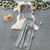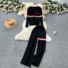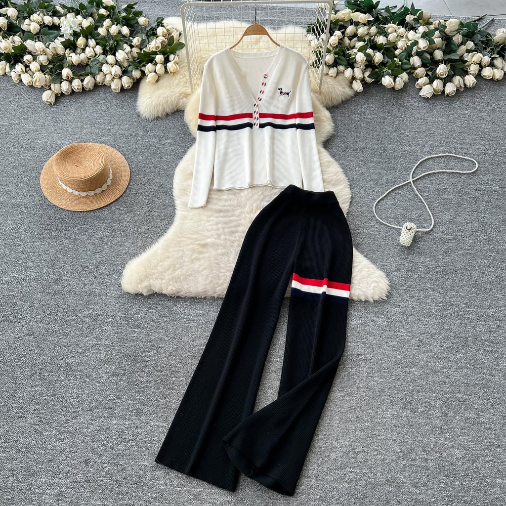Autumn Winter Women Striped Knitted Sweater Vintage Two Piece Trouser Set V-neck Pullover Tops and Wide Leg Pant Suit