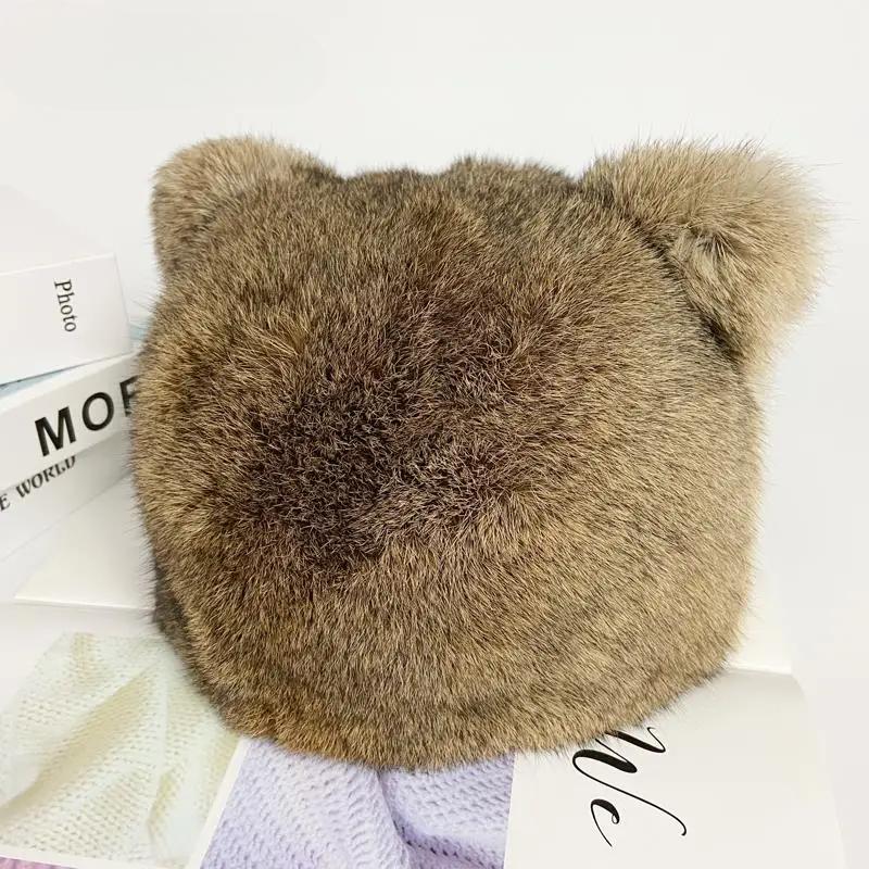 New Bunny Ears Hats Women Winter Warm Outdoor Snow Cap Natural Rabbit Fur Fluffy Caps