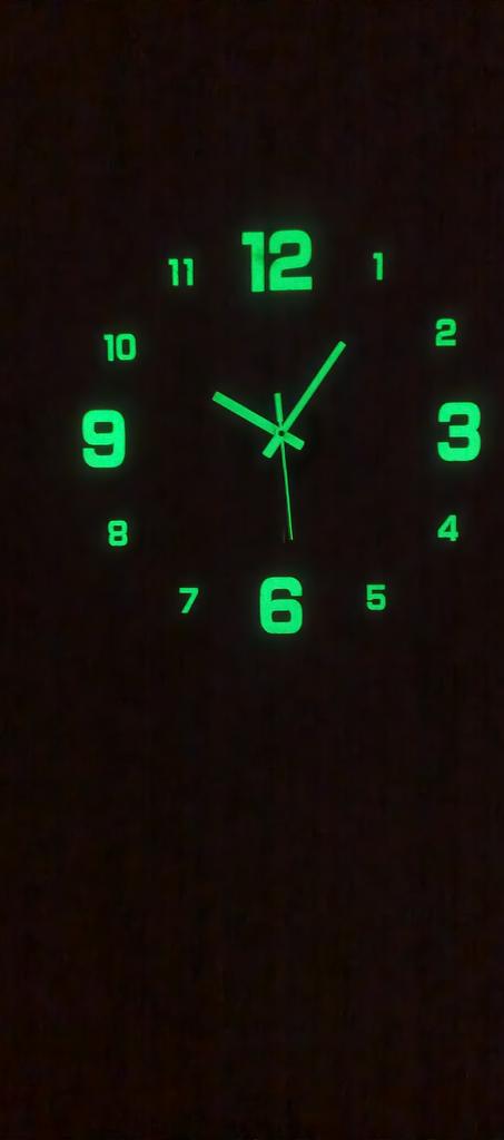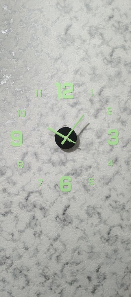 Wall clock 3D Operates on AA battery (not included). Included: ✅Mechanism with hands ✅Numbers ✅Template for correct wall pasting. ✅ Instruction Material - acrylic. In the dark, the watch glows (gathers light from sunlight or from house lighting during the day, and glows in the dark). Arrived as ordered. Satisfied with the order.