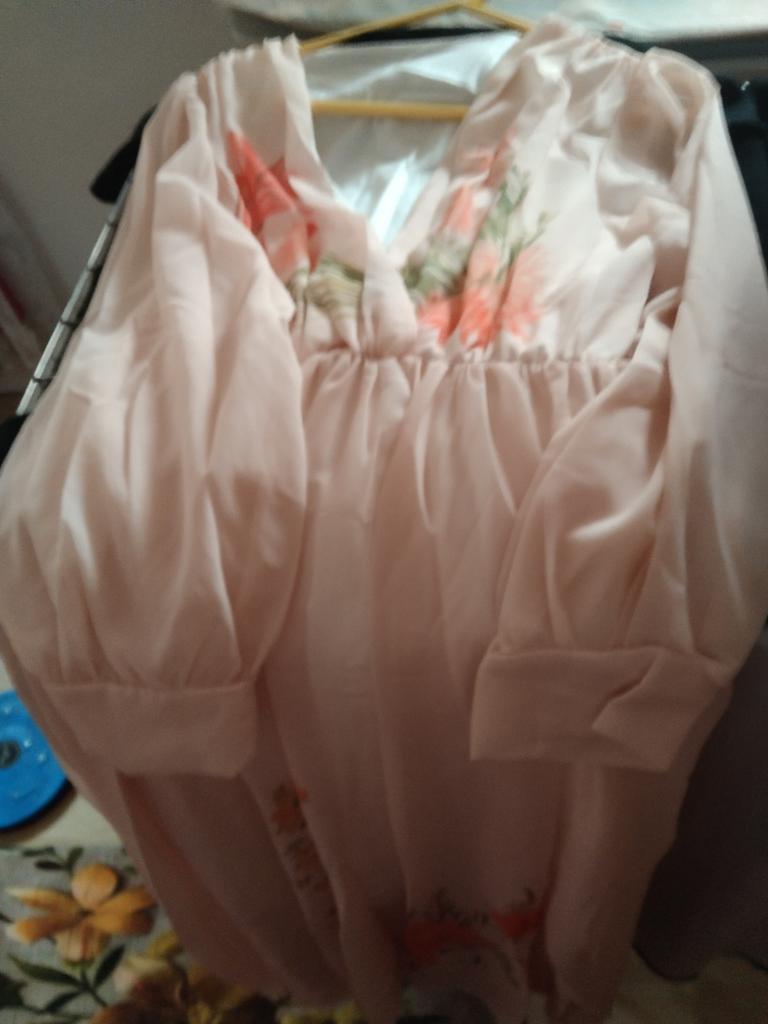 The dress is cute, but very different from the promotional photo. The promotional photo has a lot of draping incorporated during sewing, and it's very beautiful. In the dress I received, the incorporated draping is missing, only a little gathering from the elastic at the waist. The color and fabric quality match the promotional photo.
