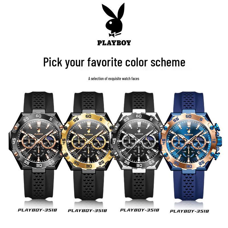 Playboy Men's Multi-Function Waterproof Sports Watch with Large Dial and Three Eye Design.
