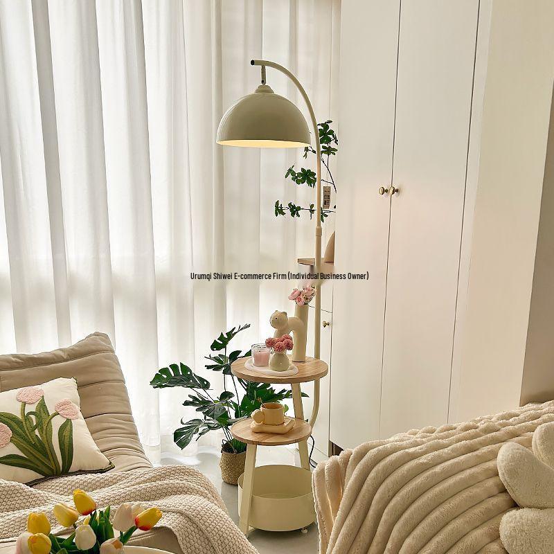 Mid-Century Cream Corner Sofa Floor Lamp and Bedside Table with Integrated Wireless Charging.