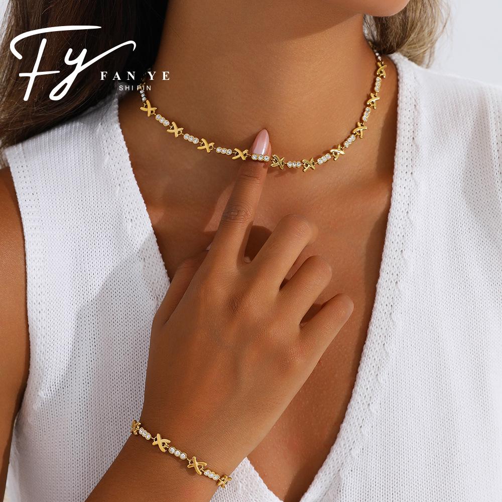 Luxurious X-Shaped Rhinestone Necklace & Full Diamond Stainless Steel Bracelet Set for Women