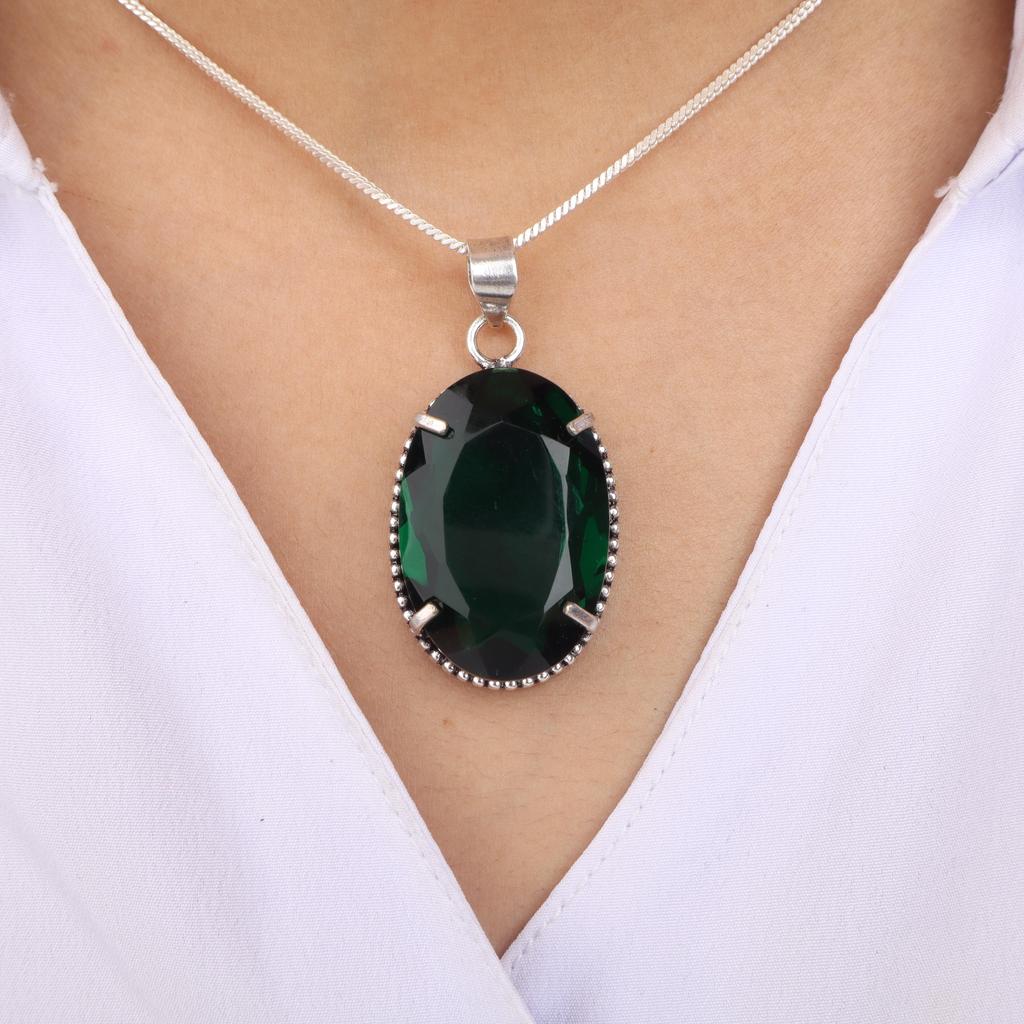 Chrome Diopside Gemstone Silver Pendant 1.75" , 925 Sterling Silver Handcrafted Jewelry, Green Stone Pendant For Gift PP-63-7
