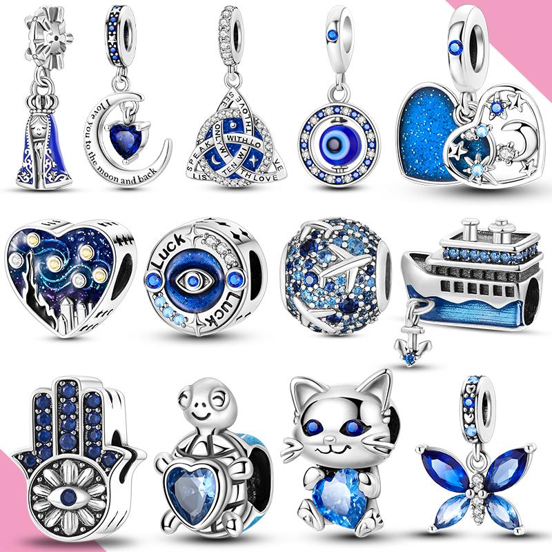 Copper Charms Beads Blue Color Cat Moon Heart Pendant Fit Original Bracelet Making Woman Jewelry