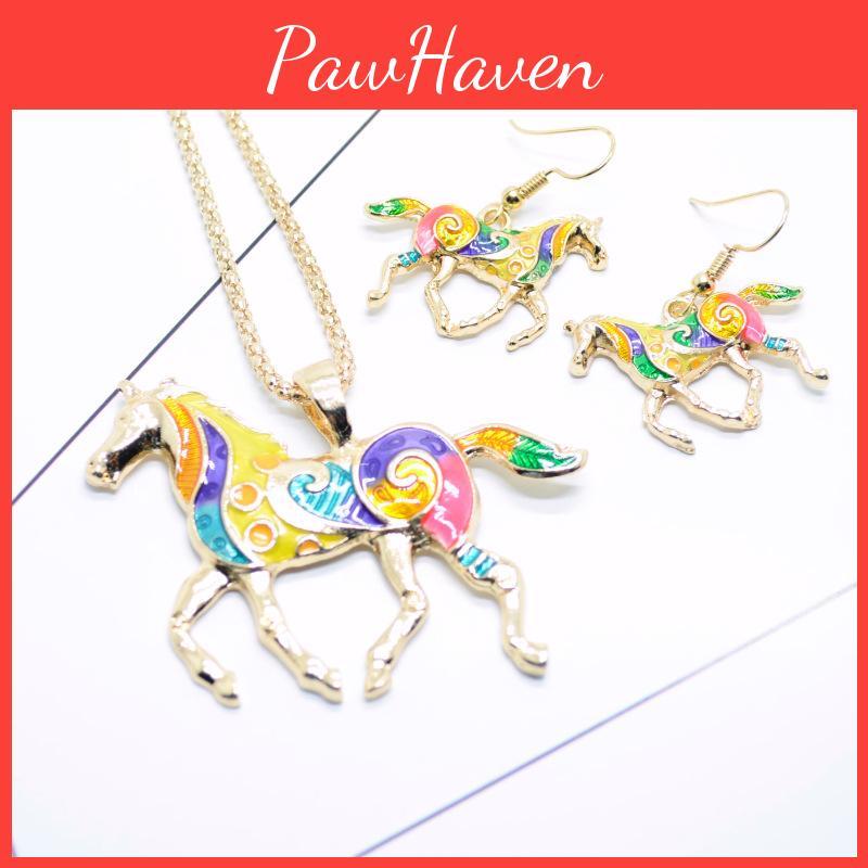 The unique design features an enchanting animal motifa delightful pony that embodies playfulness and joy. Measuring at 6 x 4.2 cm for the pendant and 3 x 3.5 cm for the earrings, the vibrant colors and intricate details create an eye-catching gradient effect that is sure to turn heads.